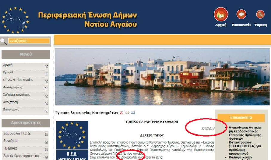 Σύμφωνα με το ρεπορτάζ της εφημερίδας, η εν λόγω ηλεκτρονική σελίδα που “χτίστηκε” προκειμένου να καταστεί ένα σύγχρονο μέσον ενημέρωσης των νησιωτών σε Κυκλάδες και Δωδεκάνησα για τα τεκταινόμενα ευρύτερα στον χώρο της Αυτοδιοίκησης, όχι μόνο δεν λειτουργεί και δεν παρέχει τη στοιχειώδη ενημέρωση σε επίπεδο ανάρτησης ανακοινώσεων, αλλά δεν περιλαμβάνει ούτε να νέα στοιχεία των ΟΤΑ για την τρέχουσα θητεία.