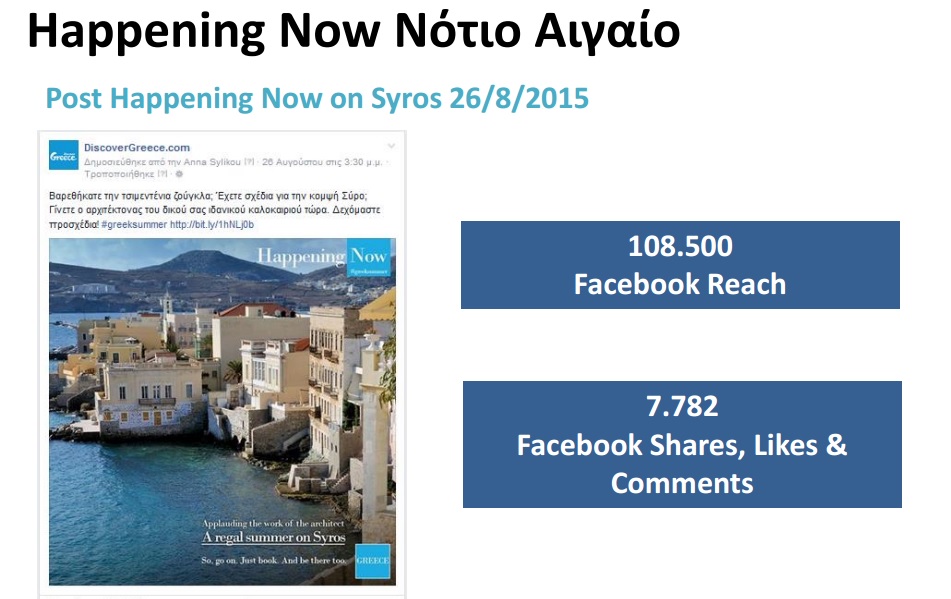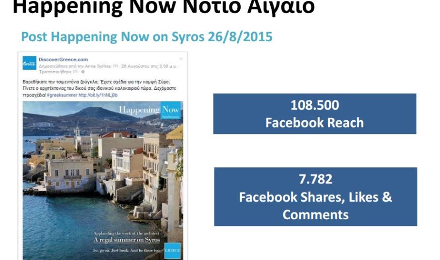 Ο νησιώτικος χώρος των Κυκλάδων κατέγραψε ως συνολική παρουσίαση 421.600 θεάσεις αλλά και 25.003 κοινοποιήσεις, like και σχόλια μέσω πέντε αναρτήσεων που υπήρξαν σε διαφορετικές ημερομηνίες εντός του διμήνου που διήρκησε η καμπάνια.