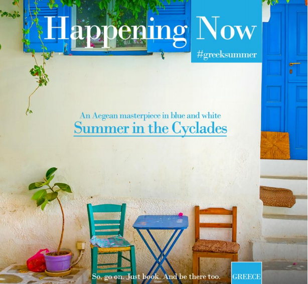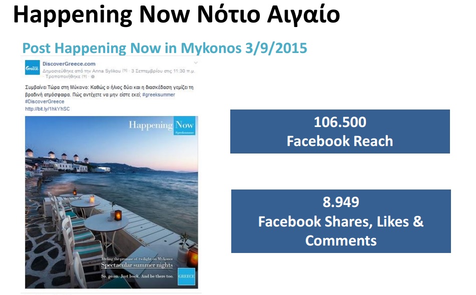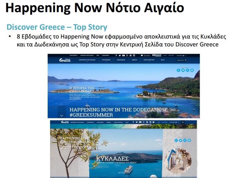 Αξίζει να επισημανθεί, πως, η καμπάνια επάνω στην οποία εξειδικεύθηκε η αντίστοιχη για το Νότιο Αιγαίου φέρει τίτλο “Happening Now in Greece” και αποτέλεσε πρωτοβουλία του Υπουργείου Τουρισμού και του ΕΟΤ, με τη συνεργασία του ΣΕΤΕ και της εταιρείας μη κερδοσκοπικού χαρακτήρα “Marketing Greece”, στόχος της οποίας ήταν να προσελκύσει τα βλέμματα του εισερχόμενου τουρισμού από Μ. Βρετανία, Γερμανία, Ιταλία, Γαλλία και Σκανδιναβικές χώρες.