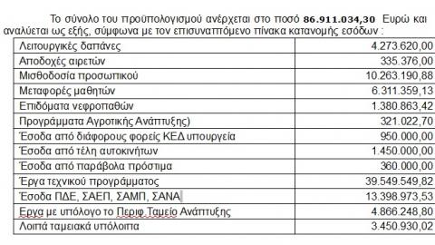 Αναλυτικότερα, το σύνολο του προϋπολογισμού της Περιφέρειας Νοτίου Αιγαίου ανέρχεται στο ποσό των 86.911.034,30 ευρώ. Στην εισήγηση προχώρησε ο πρόεδρος της Οικονομικής Επιτροπής, Φιλήμων Ζαννετίδης μετά από τις σχετικές αποφάσεις που έλαβαν τα μέλη του. Ειδικότερα, για την κάλυψη λειτουργικών δαπανών προβλέπεται το ποσό των 4.273.620 ευρώ, ενώ για αποδοχές αιρετών 335.376 ευρώ και για τη μισθοδοσία του προσωπικού 10.263.190,88 ευρώ. Σχετικά με το κομμάτι της μεταφοράς μαθητών έχουν προϋπολογισθεί περί τα 6.311.359,13 ευρώ, για τα επιδόματα νεφροπαθών 1.380.863,42 ευρώ και για τα προγράμματα αγροτικής ανάπτυξης 321.022,70 ευρώ. Σε επίπεδο εσόδων από διάφορους φορείς ΚΕΔ, υπουργεία έχει καταγραφεί το ποσό των 950.000 ευρώ, για έσοδα από τέλη αυτοκινήτων 1.450.000 ευρώ, καθώς επίσης για έσοδα από παράβολα πρόστιμα 360.000 ευρώ. Στον κατάλογο με τα αριθμητικά στοιχεία για τα έργα του τεχνικού προγράμματος έχουν προβλεφθεί 39.549.549 ευρώ ενώ για έσοδα ΠΔΕ-ΣΑΕΠ-ΣΑΜΠ-ΣΑΝΑ 13.398.973,53 ευρώ. Το ποσό των έργων με υπόλογο το Περιφερειακό Ταμείο Ανάπτυξης προϋπολογίζεται σε 4.866.248,80 ευρώ ενώ τα λοιπά ταμειακά διαθέσιμα προβλέπονται σε 3.450.930,02 ευρώ.