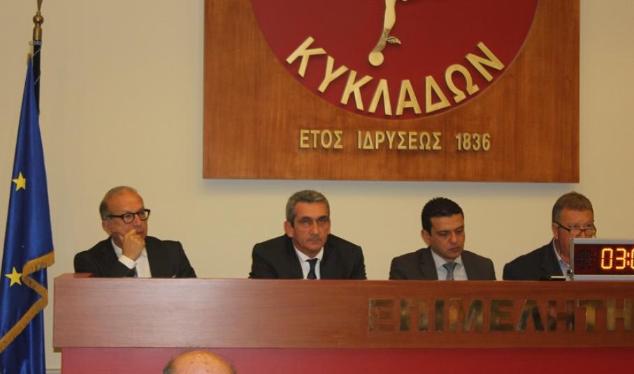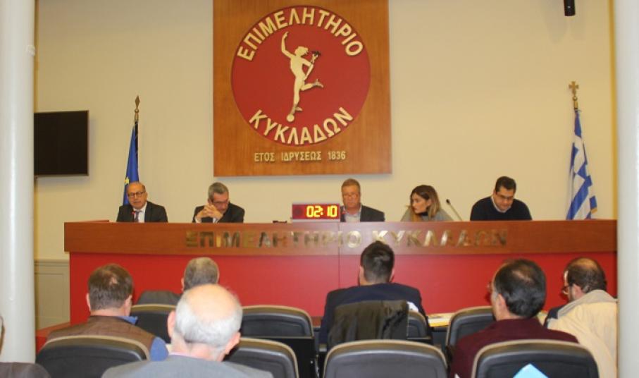 Η πρώτη συνεδρίαση του περιφερειακού συμβουλίου για το 2016 πραγματοποιήθηκε στην πλήρως ανανεωμένη και σύγχρονη πλέον αίθουσα του Επιμελητηρίου Κυκλάδων, με τον πρόεδρό της, Γιάννη Ρούσσο να υποδέχεται τους συμβούλους σε μία πρώτη δοκιμαστική λειτουργία του χώρου και του νέου εξοπλισμού.