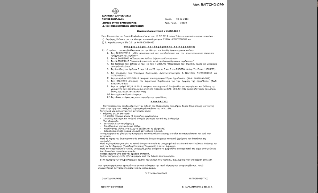 Η παραγωγή του εν λόγω έργου που αφορούσε στην έκδοση των ημερολογίων, στα σχετικά έγγραφα της Δημοτικής αρχής, της απόφασης (30057), της απόφασης ανάθεσης (30213) αλλά και του ιδιωτικού συμφωνητικού που υπογράφηκε μεταξύ του Δήμου και εκπροσώπου της επιχείρησης (30539), τα οποία υπογράφει ο αρμόδιος Αντιδήμαρχος, Δ. Ρούσσος, δεν αναγράφεται πουθενά η ποσότητα των αντιτύπων, παρά του ότι όλες οι λεπτομέρειες που αφορούν στην έκδοση αναγράφονται αναλυτικά.