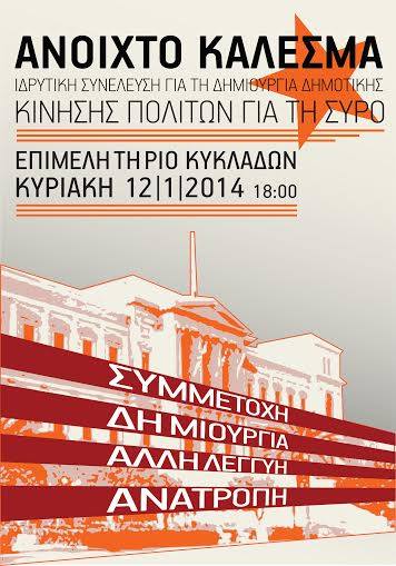 “Εμείς, πολίτες της Σύρου, γυναίκες και άνδρες, με καταβολές στον χώρο των κοινωνικών κινημάτων και των κοινωνικών αγώνων, της οικολογίας και του πολιτισμού, ενεργοί πολίτες της Σύρου, που αγωνιζόμαστε για μια καλύτερη ποιότητα ζωής με σεβασμό στον πολίτη και τις ανάγκες του, για την πλήρη και σταθερή απασχόληση, για κοινωνικές υποδομές αντάξιες της αξιοπρέπειας των δημοτών, για την προώθηση της αλληλεγγύης με βάση το σύνθημα "κανένας μόνος του στη κρίση", για την ανάπτυξη και την πρόοδο του τόπου με γνώμονα τα συμφέροντα των πολιτών και όχι των λίγων, για ένα διαφορετικό μοντέλο αυτοδιοίκησης, ουσιαστικά αποκεντρωμένης και δημοκρατικής, παίρνουμε την πρωτοβουλία να συγκροτήσουμε μια δημοτική κίνηση που θα αποτελέσει την εναλλακτική λύση-πρόταση για το νησί μας", αναφέρει το σχετικό δελτίο Τύπου.
