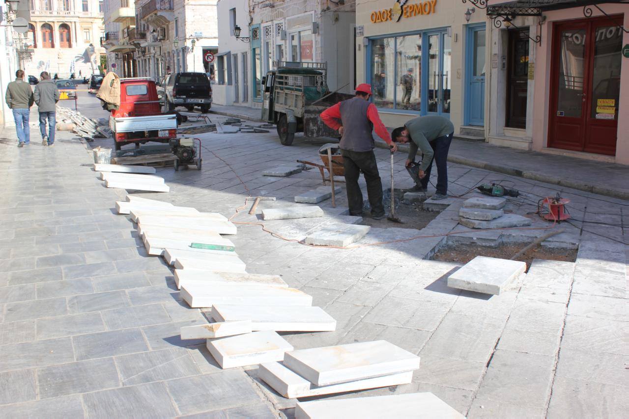 Το συχνότερο πρόβλημα το οποίο αντιμετωπίζεται μέσα από τις παρεμβάσεις που επιβλέπει η Τεχνική Υπηρεσία του δήμου Σύρου – Ερμούπολης είναι η αποκόλληση μαρμάρινων πλακών από το δρόμο, η οποία θα μπορούσε να οδηγήσει ακόμα και στην πρόκληση ατυχημάτων. Τον κύκλο των εργασιών για το 2014 άνοιξαν μικρές παρεμβάσεις στον γρανίτη της Οδού Θερμοπυλών και Φολεγάνδρου, ενώ στο πλαίσιο της εργολαβίας, θα πραγματοποιηθούν αντίστοιχα έργα στην πλατεία Τσιροπινά. Στόχος των έργων είναι η αντικατάσταση των υπαρχουσών πλακών και η βελτίωση του υποστρώματος.