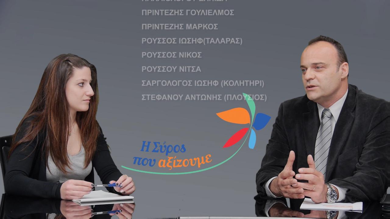 “Θεωρώ ότι σε οποιοδήποτε χώρο πρέπει να υπάρχει ένας συγκεκριμένος χρόνος που θα ασχοληθείς με τα πράγματα που απασχολούν αυτόν το χώρο. Νομίζω λοιπόν, ότι όσο το δυνατόν περισσότερο υπάρχει ανανέωση, ακόμη και στα θέματα της Τοπικής Αυτοδιοίκησης, τότε θα μπορέσουν να προχωρήσουν κάποια πράγματα και να προωθηθούν κάποιες ιδιαιτερότητες που πρέπει να ακολουθήσουμε για να αναπτύξουμε επιχειρηματικότητα, κοινωνικότητα. Πιστεύω ότι τα νέα μυαλά και οι νέοι άνθρωποι με τη δυναμική που έχουν και απαρτίζουν το συνδυασμό μας είναι ικανοί να αλλάξουν το πολιτικό, κοινωνικό, οικονομικό σκηνικό που απασχολεί σήμερα τη Σύρο. Όσον αφορά στην εμπειρία, δεν αρκεί να υπάρχει μόνο αυτό το στοιχείο στα αυτοδιοικητικά πράγματα. Ο κάθε ένας από εμάς έχει έναν χώρο δουλειάς και μία εμπειρία στο επάγγελμά του. Όλες αυτές οι εμπειρίες που έχει ο κάθε ένας – στη διαχείριση ανθρώπινου δυναμικού, οικονομικών πόρων, στο marketing κτλ – εάν παντρευτούν, δε θα υπάρχει πρόβλημα. Αντίθετα θα δώσουν μάλλον το αποτέλεσμα που για όλους μας είναι επιθυμητό”.