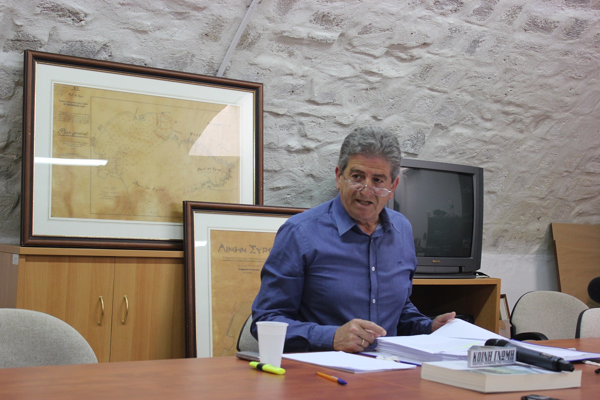Ο κ. Βελισσαρίου ξεκίνησε τον απολογισμό του μιλώντας για τα δύο σημαντικότερα έργα που πραγματοποιήθηκαν την τρέχουσα θητεία για το λιμάνι της Ερμούπολης και συγκεκριμένα για την καθαίρεση του υφάλου της καρφωμένης και την ενίσχυση θωράκισης του προσήνεμου μώλου στην περιοχή Νησάκι.
