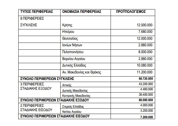 Στο περιεχόμενο της πρόσκλησης μάλιστα, η ΕΕΤΑΑ παρουσιάζει ακριβώς τα ποσά που αφορούν σε κάθε Περιφέρεια της Ελλάδας, με το Νότιο Αιγαίο σταθερά να λαμβάνει μία από τις χαμηλότερες χρηματοδοτήσεις, η οποία τόσο για τις Κυκλάδες, όσο και για τα Δωδεκάνησα συνολικά δεν ξεπερνά τα 3.200.000 ευρώ.