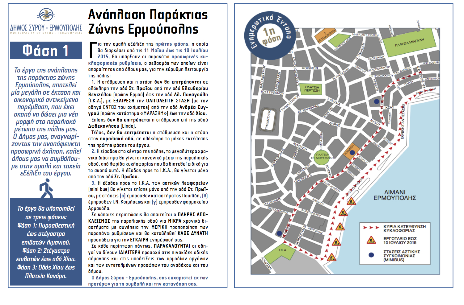 Το σύνολο των αλλαγών που θα ισχύσουν στην κυκλοφοριακή ροή περιλαμβάνεται στο σχετικό ενημερωτικό έντυπο που διένειμαν το πρωί του Σαββάτου στις καφετέριες της παραλιακής ζώνης ο δήμαρχος, Γιώργος Μαραγκός από κοινού με άλλα μέλη της Δημοτικής Αρχής και του Δημοτικού Λιμενικού Ταμείου Σύρου, προκειμένου να πληροφορηθούν οι δημότες του νησιού για τα μέτρα που θα ισχύσουν στην Α΄ Φάση υλοποίησης του έργου.