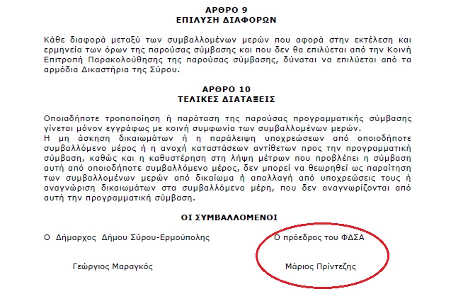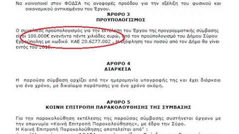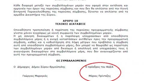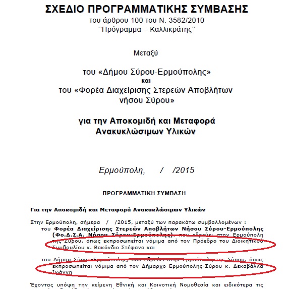 Εκτεθειμένοι έναντι των δημοτών της Σύρου βρίσκονται τόσο οι αιρετοί και ειδικότερα οι άμεσα υπεύθυνοι του ΦΟΔΣΑ και της Δημοτικής Αρχής, όσο όμως και τα πρόσωπα ή το πρόσωπο που συνέταξε το σχέδιο της προγραμματικής σύμβασης, αφού οι μεν, δεν εξέτασαν τί παραλάμβαναν και υπέγραφαν ενώ οι δε, παρέδωσαν μία σύμβαση με λανθασμένα στοιχεία, που αυτή τη στιγμή θέτει στον αέρα το αντικείμενό της. Συγκεκριμένα, η σύμβαση ύψους 100.000 ευρώ αφορά στη συνεργασία Δήμου Σύρου – Ερμούπολης και ΦΟΔΣΑ για το έργο της αποκομιδής και μεταφοράς των ανακυκλώσιμων υλικών. Στην δημοσιευμένη απόφαση που περιέχει την τετρασέλιδη σύμβαση, παρατηρούνται συγκεκριμένα λάθη, τα οποία αν είχε προηγηθεί έστω με μία απλή ανάγνωση, θα είχαν γίνει αντιληπτά. Αυτά έχουν ως εξής: Αρχικά ως εκπρόσωπος του Δήμου Σύρου – Ερμούπολης και ως δήμαρχος αναφέρεται ο Γιάννης Δεκαβάλλας και ως πρόεδρος του ΦΟΔΣΑ ο Στέφανος Βακόνδιος, ενώ αναφορικά με το κόστος για την εκτέλεση του έργου ενώ αναφέρεται το ποσό των 100.000 ευρώ, αυτό ολογράφως έχει μεταφερθεί σε “ενενήντα πέντε χιλιάδες ευρώ”. Παρόλα αυτά, στο τέλος της σύμβασης, ως συμβαλλόμενοι αναφέρονται ορθώς ο νυν δήμαρχος Γιώργος Μαραγκός ενώ ως πρόεδρος του ΦΟΔΣΑ έχει καταγραφεί λανθασμένα το όνομα “Μάριος Πρίντεζης”.