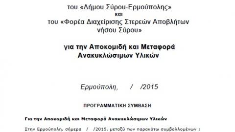 Αλγεινή εντύπωση προκάλεσε η είδηση πως σύσσωμο το δημοτικό συμβούλιο του Δήμου Σύρου – Ερμούπολης ψήφισε κι ενέκρινε ομόφωνα το σχέδιο της προγραμματικής σύμβασης ανάμεσα σε Δήμο και Φορέα Διαχείρισης Στερεών Αποβλήτων (ΦΟΔΣΑ) για το έργο της αποκομιδής και μεταφοράς των ανακυκλώσιμων υλικών, χωρίς τα μέλη του να έχουν προχωρήσει στην ανάγνωση του μόλις τετρασέλιδου περιεχομένου του, το οποίο περιείχε εξόφθαλμα λάθη.