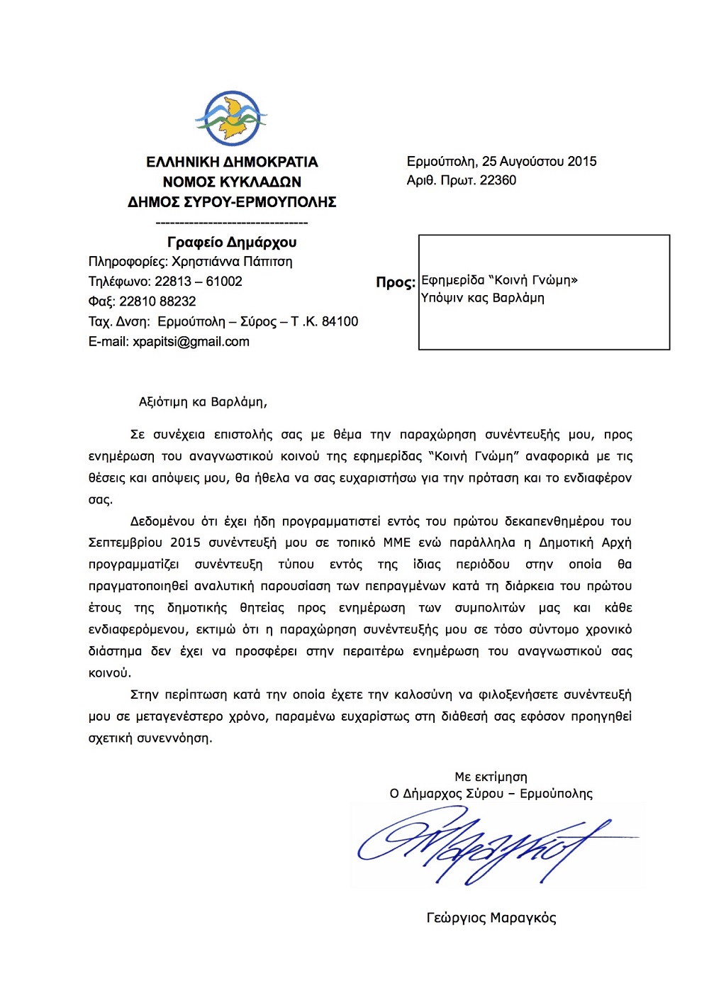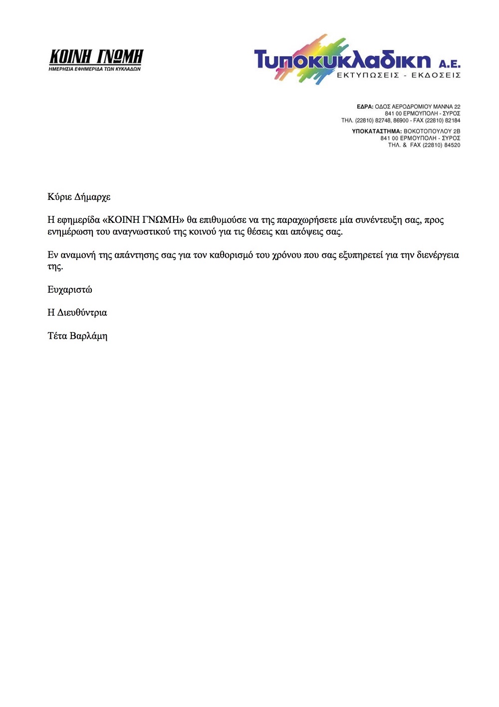 Και προκαταλαμβάνοντας δε τους σχολιασμούς, που θα επιχειρήσουν να αποδώσουν την παρούσα κριτική των Δημαρχιακών επιλογών στην άρνηση του να παραχωρήσει συνέντευξη στην «Κοινή Γνώμη», ενημερώνουμε ότι η κίνηση αυτή ήταν ο πλέον πρόσφορος τρόπος επιβεβαίωσης της αποφυγής εκ μέρους του ενός δημοσίου διαλόγου.