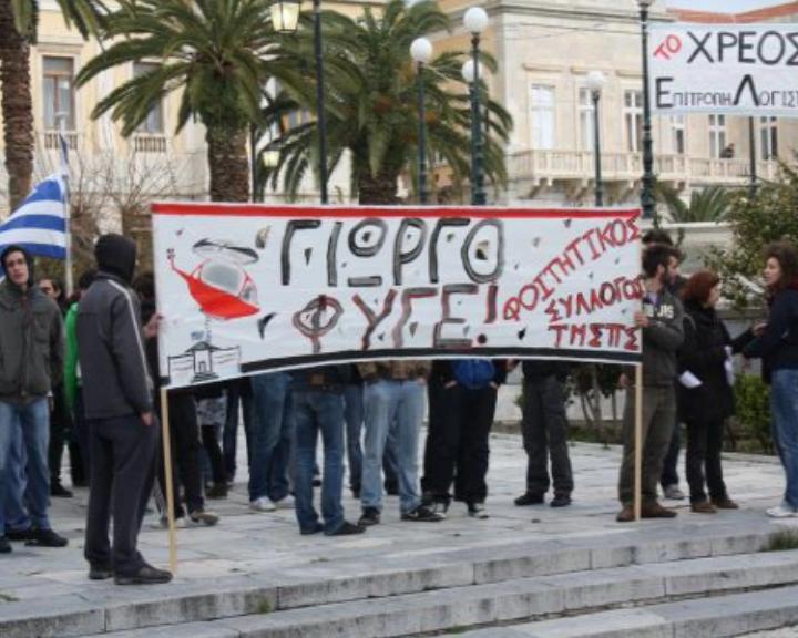 Στις 21 Μάρτη 2011, η νεολαία της Σύρου καθώς και πλήθος εργαζομένων διαδήλωσαν ενάντια στην πολιτική των Μνημονίων και της κοινωνικής λεηλασίας . Υποδέχτηκαν με τον τρόπο που ταίριαζε τον τότε πρωθυπουργό που επιθυμούσε απλά να στήσει μια επικοινωνιακή φιέστα στο νησί για να αποκρύψει τη βαρβαρότητα της πολιτικής του. Ακύρωσαν και απονομιμοποίησαν την κυβερνητική πολιτική και έστειλαν ένα ηχηρό μήνυμα αντίστασης και αγώνα σε όλη τη χώρα.