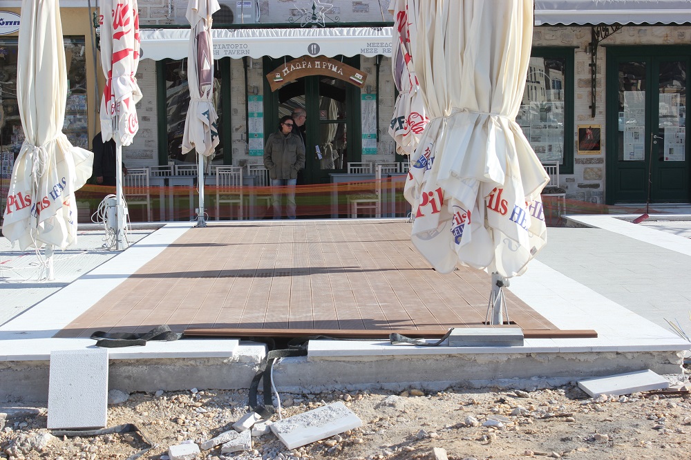 Πέραν αυτού, με εντατικούς ρυθμούς πρέπει να συνεχίσει και η τοποθέτηση των ξύλινων δαπέδων επί των οποίων θα αναπτυχθούν τα τραπεζοκαθίσματα, με τις πρώτες εργασίες να έχουν ξεκινήσει από προχθές και μάλιστα από το ύψος της επιχείρησης “Okio”.
