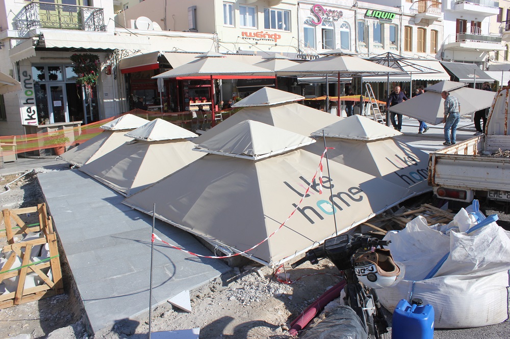 Ειδικότερα, οι τοποθετήσεις των ομπρελών που διαθέτουν οι επιχειρηματίες ξεκίνησε και σχεδόν ολοκληρώθηκε, με προσωπική τους μέριμνα, προκειμένου να προχωρήσουν οι εργάτες στο επόμενο στάδιο των δαπέδων. Σύμφωνα με τις πληροφορίες της εφημερίδας, οι ομπρέλες αποτελούν προσωρινή λύση για τις επιχειρήσεις της παραλίας, αφού μέχρι σήμερα δεν υπήρχε μελέτη για την τοποθέτηση στεγάστρων. Κοινή παρατήρηση των επιχειρηματιών είναι πως, απαιτείται στο παραλιακό μέτωπο η διαμόρφωση μίας ομοιόμορφης εικόνας, δεδομένου ότι η κάθε επιχείρηση διαθέτει τις δικές της ομπρέλες, οι οποίες σε καμία περίπτωση δεν συνυπάρχουν αρμονικά, πόσο μάλλον με φόντο την βελτιωμένη εικόνα που εκτιμάται ότι θα παρουσιάσει συνολικά η “βιτρίνα” της πόλης. Οι ίδιες πληροφορίες, θέλουν η αντικατάστασή τους με τα πολυσυζητημένα στέγαστρα να πραγματοποιηθεί όταν θα είναι έτοιμη η σχετική μελέτη, βάσει της οποίας θα επιλεγεί ο καλύτερος δυνατός τρόπος εγκατάστασής τους. Η αφαίρεση των ομπρελών, με δεδομένο ότι οι βάσεις τους έχουν βιδωθεί στο δάπεδο, κατά πάσα πιθανότητα θα προχωρήσει με το “κόψιμο” των στύλων τους, ενώ το κενό που θα προκύψει προβλέπεται να καλυφθεί με ομοιόμορφο κομμάτι του δαπέδου.