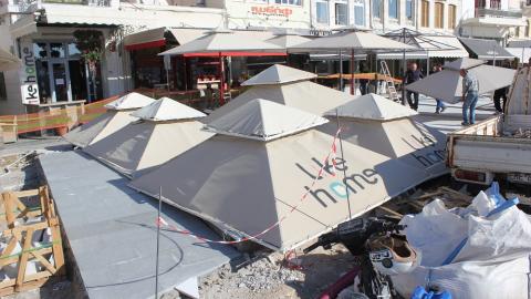Προκειμένου να μπορέσουν οι επιχειρηματίες να αναπτύξουν τα τραπεζοκαθίσματα στον εξωτερικό χώρο που θα μισθώνουν, ήδη βρίσκονται σε εξέλιξη οι εργασίες τοποθέτησης του ειδικού δαπέδου. Παλέτες με τμήματα που επαρκούν για την κάλυψη των συνολικών τετραγωνικών μέτρων μπροστά από τις επιχειρήσεις, έχουν μεταφερθεί στο παραλιακό τμήμα, με πέντε τουλάχιστον εργάτες να προχωρούν στις σχετικές παρεμβάσεις. Αν και δεν μπορούν να υπάρξουν εκτιμήσεις για τον χρόνο υλοποίησης των συγκεκριμένων εργασιών, ωστόσο, η επίτευξη του στόχου στον καλύτερο δυνατό χρόνο αξιολογείται τουλάχιστον επιβεβλημένη.
