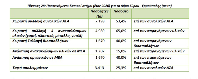 Κυριότερη πρόταση του νέου ΤΣΔΑ, αποτελεί η εγκατάσταση ενός κεντρικού, μεγάλου «Πράσινου Σημείου», εντός ή πλησίον της Ερμούπολης και πρόσθετων μικρότερων σε μεγάλους οικισμούς ή κομβικά σημεία στα χωριά, προκειμένου, ο πολίτης να έχει τη δυνατότητα να μεταφέρει τα ανακυκλώσιμα υλικά, βοηθώντας στην συλλογή τους από τις υπηρεσίες του Δήμου. Παράλληλα, προτείνεται η καθιέρωση κινήτρων για τους κατοίκους, οι οποίοι συμβάλλουν ενεργά στη μείωση του όγκου των σύμμεικτων απορριμμάτων, που καταλήγουν στον ΧΥΤΑ.