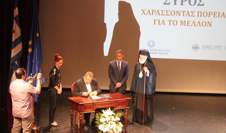Στο πλαίσιο της επίσημης εκδήλωσης που διοργανώθηκε το πρωί της Τρίτης στο θέατρο “Απόλλων” με επίσημο προσκεκλημένο πρόσωπο, τον Υπουργό Εθνικής Άμυνας, Πάνο Καμμένο, ο ίδιος, από κοινού με τον Δήμαρχο Σύρου – Ερμούπολης, Γιώργο Μαραγκό προχώρησαν στην υπογραφή του συμφώνου συναντίληψης, που περιλαμβάνει τον γενικό άξονα, επί του οποίου εντός του προσεχούς εξαμήνου, θα πρέπει να εξειδικευθεί το πλαίσιο της συνεργασίας των δύο προαναφερθεισών πλευρών ως “στρατηγικών εταιρών”.