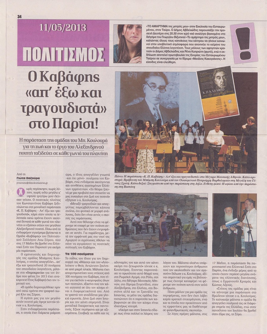 Με τις συγκεκριμένες φράσεις, ο Μπάμπης Κουλούρας, περιγράφει στη συνέντευξη που παραχώρησε στην εφημερίδα, τον σκοπό της ύπαρξης της Ομάδας “Καβάφης” του Πολιτιστικού Συλλόγου Άνω Σύρου, η οποία πρόσφατα “χτύπησε” δυναμικά για ακόμη μία φορά στο Παρίσι και συγκεκριμένα στη “Διεύθυνση Ελληνικού Σπιτιού”, παρουσιάζοντας το αφιέρωμα “Κ.Π. Καβάφης – απ’ έξω και τραγουδιστά” στο πλαίσιο του έτους Καβάφη με αφορμή τα 150 χρόνια από τη γέννησή του.