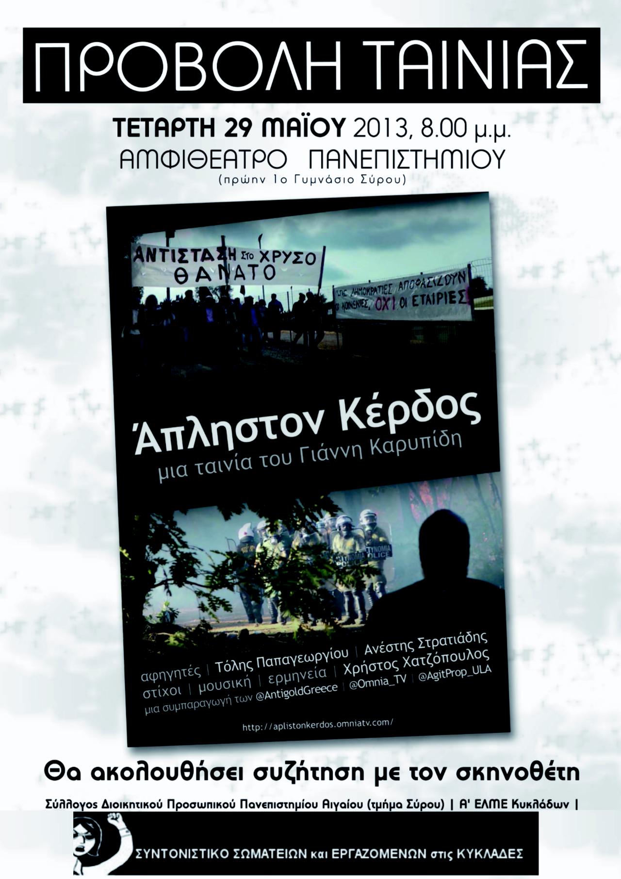 Μια περιήγηση στο Κιλκίς, τις Σκουριές και τη Θράκη, τους τόπους όπου εδώ και 15 χρόνια οι κάτοικοι αντιστέκονται στις εξορύξεις χρυσού, προσφέρει η ταινία του Γιάννη Καρυπίδη, «Άπληστον Κέρδος» που προβάλλεται αύριο στις 8 το βράδυ στο Αμφιθέατρο του Πανεπιστημίου Αιγαίου στη Σύρο.
