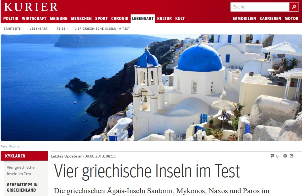 "Τέσσερα ελληνικά νησιά σε τεστ" είναι ο τίτλος της αυστριακής εφημερίδας Kurier, στην οποία "πρωταγωνιστούν" η Σαντορίνη, η Μύκονος, η Πάρος και η Νάξος.