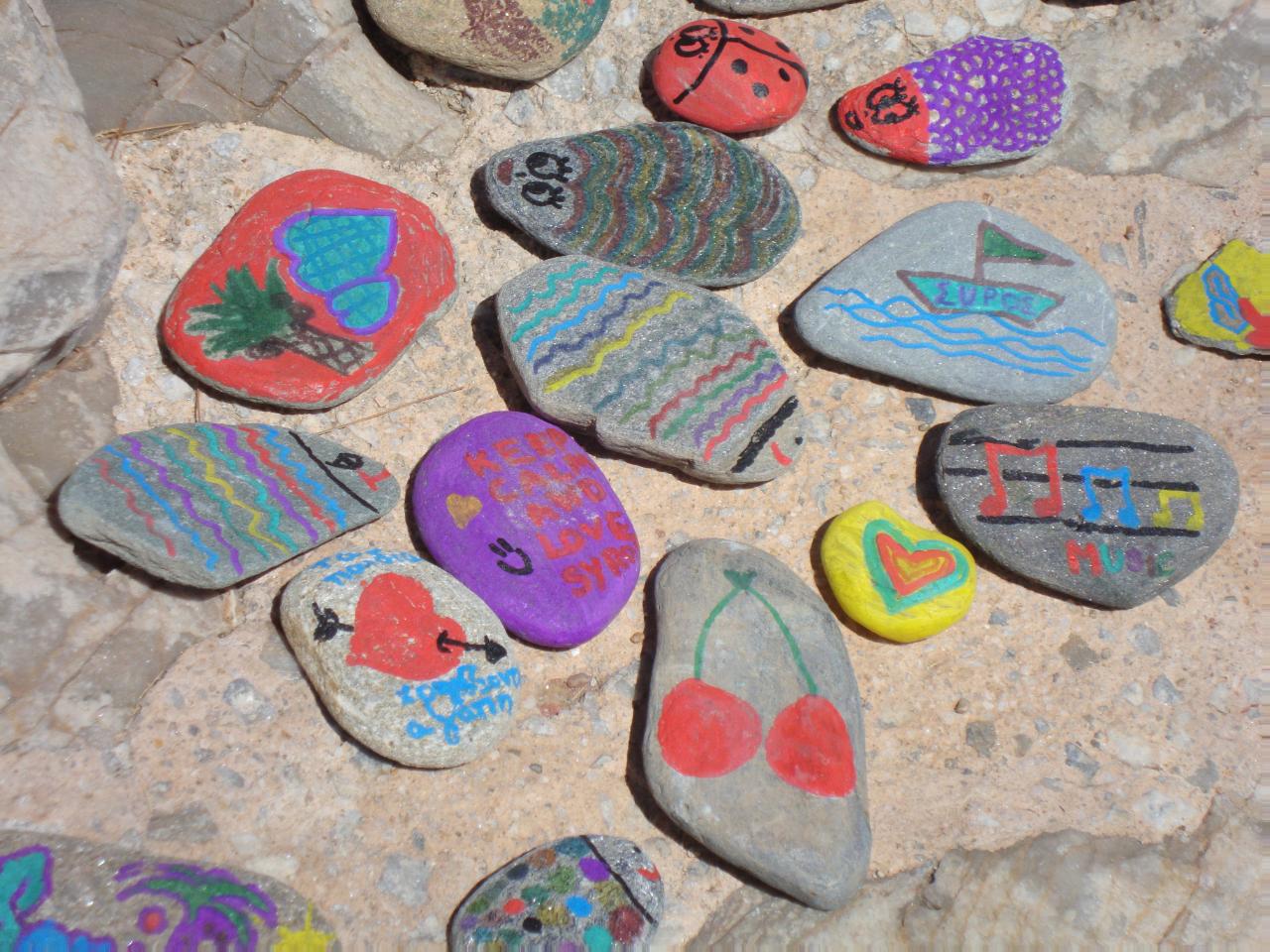 Η Σοφία, η Σελίν, η Αιμιλία και η άλλη Σοφία είδαν μια μέρα ένα ζωγραφισμένο βότσαλο και τους άρεσε πολύ. Τι όμορφο! Μ’ ένα τρυφερό και… πικάντικο χαμόγελο με ρώτησαν πως θα μπορούσαν κι εκείνες να ζωγραφίσουν ένα βότσαλο. Πήραν τα χρώματα, πήραν τους κατάλληλους μαρκαδόρους, σχεδίασαν ψαράκια, ζωάκια, λουλούδια, φρούτα και έτρεξαν στην παραλία να μαζέψουν… λαλάρια, φρόντιζαν να είναι ίσια, επίπεδα και ανακάλυψαν ότι τα θαλασσινά βότσαλα είναι σε διάφορα χρώματα. Ε, βέβαια. Άλλα είναι άσπρα από μάρμαρο, αλλά γκρι ή κόκκινα από πωρόλιθο κ.α. Τι όμορφες ζωγραφιές. Γέμισαν ένα καλάθι και.. όλες μαζί αποφάσισαν να τα πουλήσουν και όσα χρήματα μαζέψουν να τα προσφέρουν στη «Στέγη Ανηλίκων». Έφτιαξαν και μια ωραία μικρή ταμπελίτσα και έγραψαν (ελληνικά και αγγλικά) ότι ζωγραφίζουν βότσαλα και τα χρήματα από την πώληση θα είναι για τη «Στέγη Ανηλίκων». Ξεκίνησε η χαριτωμένη μικρή παρεούλα και πήγαινε στα μαγαζιά του Φοίνικα, στις ταβέρνες, στην προβλήτα με τα κότερα και όλοι τις υποδέχονταν με πολύ καλή διάθεση. Και φυσικά τα χρήματα που κατάφεραν να συγκεντρώσουν, πήγαν οι ίδιες οι μικρές φίλες στη Στέγη και τα προσέφεραν, συνοδευόμενες από τη μαμά Νταϊάνα.