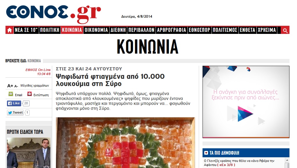 Σε μία υπέροχη αναφορά για το Φεστιβάλ Λουκουμιού που θα πραγματοποιηθεί στη Σύρο το διήμερο της 23ης και της 24ης Αυγούστου προχώρησε η εφημερίδα “Έθνος” χθες το μεσημέρι προβάλλοντας το νησί μέσα από το παραδοσιακό προϊόν του, το λουκούμι.