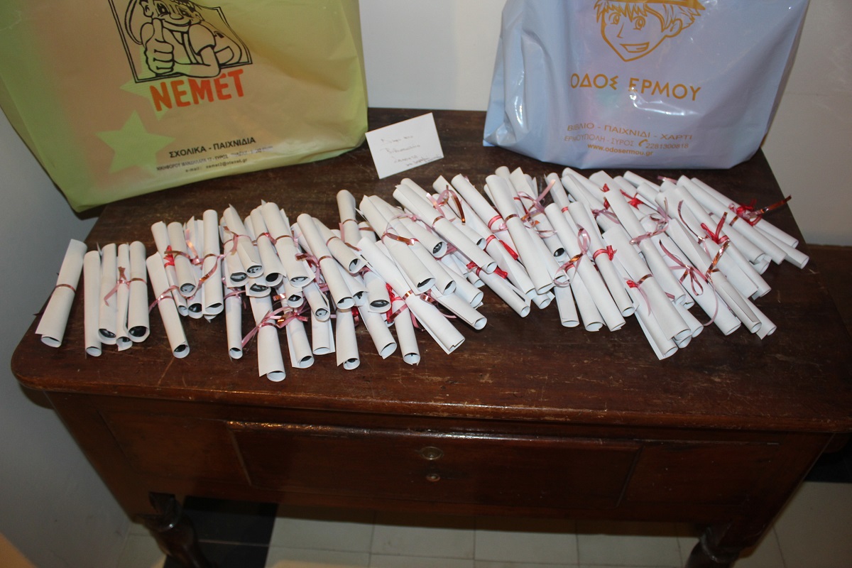 Μέσα στα έργα τους οι μαθητές αποτύπωσαν το νησί τους έτσι ακριβώς όπως το ονειρεύονται και λαχταρούν να το δουν. Το 1ο βραβείο απονεμήθηκε στη μαθήτρια της Γ' Τάξης του 1ου Δημοτικού Σχολείου Ερμούπολης, Κατερίνα Γκούμα, το 2ο βραβείο παρέλαβε η Κατερίνα Ρούσσα, μαθήτρια της Ε' Τάξης του 2ου Δημοτικού Σχολείου Ερμούπολης, ενώ το 3ο βραβείο απονεμήθηκε στην Αντωνία, μαθήτρια της Α' Δημοτικού του Δημοτικού Σχολείου Ποσειδωνίας.