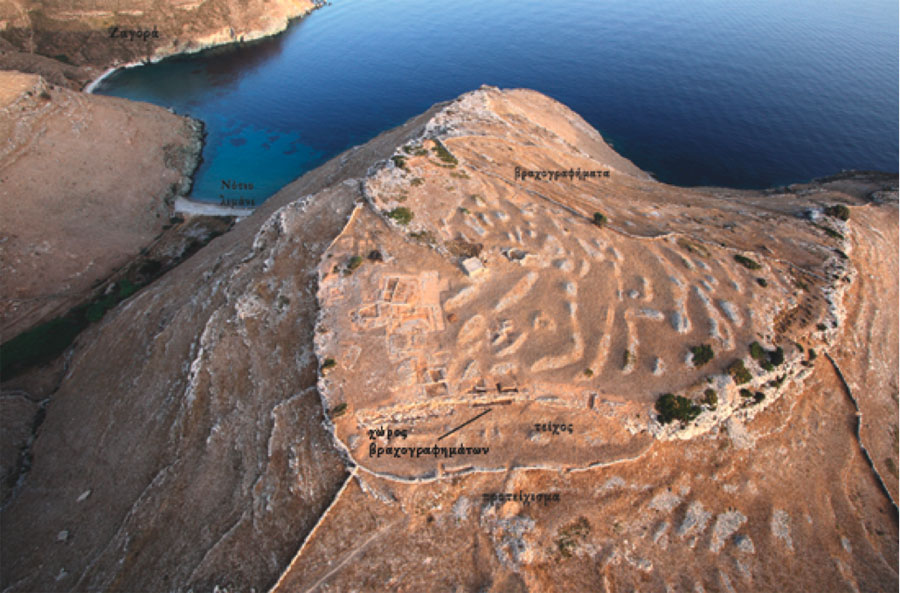 Ιδιαίτερο εύρημα του οικισμού αποτελούν οι εκτεταμένες επίκρουστες ή σκαλιστές βραχογραφίες που κοσμούν το τείχος, το δάπεδο του ιερού και τμήματα του βράχου κατά μήκος του τείχους με παραστάσεις φυσιοκρατικές (ζώα, ψάρια και πάνω από 60 πλοία) και συμβολικές (σπείρες, δακτυλιόσχημα θέματα στο σχήμα των νεολιθικών ειδωλίων).