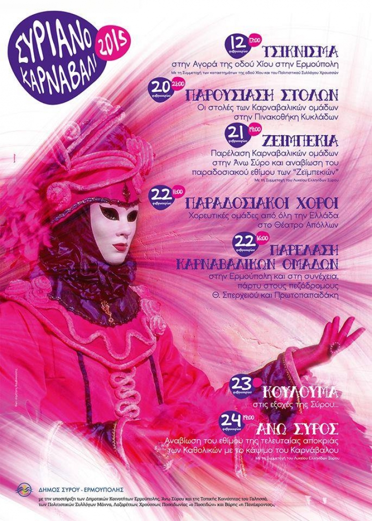 Πιο εντυπωσιακό και οργανωμένο από κάθε άλλη φορά αναμένεται το “Συριανό Καρναβάλι”, το οποίο επιστρέφει για πέμπτη συνεχή χρονιά, φιλοδοξώντας να ξεχωρίσει και φέτος για τον πλούτο και την ποιότητα των εκδηλώσεών του, οι οποίες θα πραγματοποιηθούν από 12 έως 24 Φεβρουαρίου.