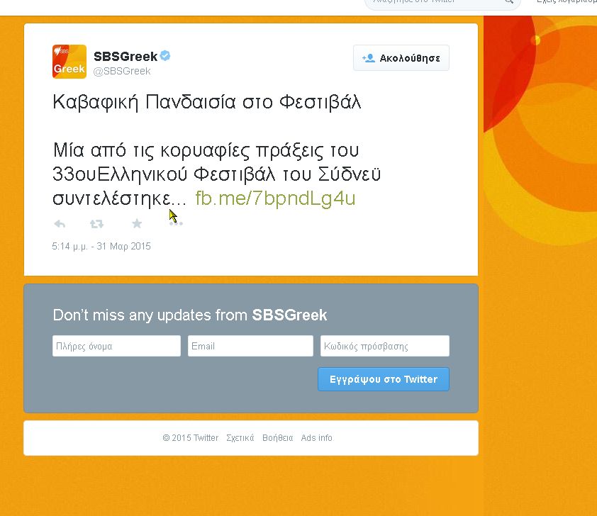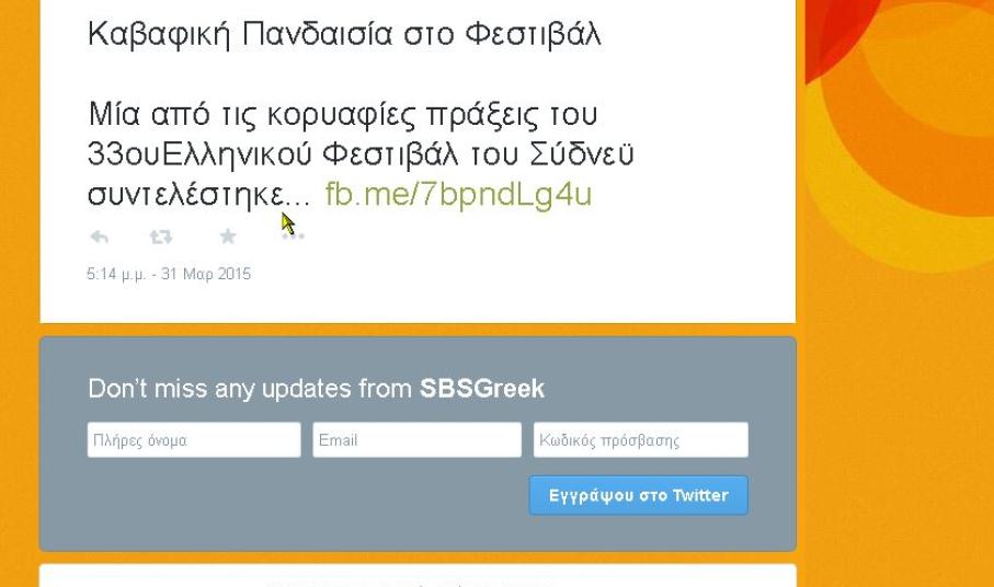 Η ΄΄ΟΜΑΔΑ ΚΑΒΑΦΗΣ’’ συμμετείχε σε δύο πολύ σπουδαία φεστιβάλ της Αυστραλίας. Στο 33th GREEK FESTIVAL OF SYDNEY και στον Πολιτιστικό Μήνα του FESTIVAL HELLENICA OF ADELAIDE 2015.