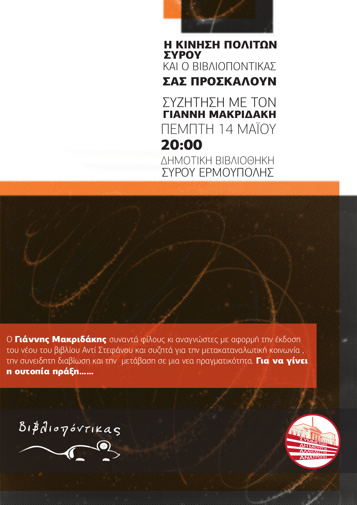 Η Κίνηση Πολιτών Σύρου & το βιβλιοπωλείο "Βιβλιοπόντικας" παρουσιάζουν τον συγγραφέα, φυσικό καλλιεργητή Γιάννη Μακριδάκη με αφορμή την έκδοση του νέου του βιβλίου «αντί Στεφάνου» σε μια συζήτηση για την μετακαταναλωτική κοινωνία, την συνειδητή διαβίωση και την μετάβαση σε μια νέα πραγματικότητα.