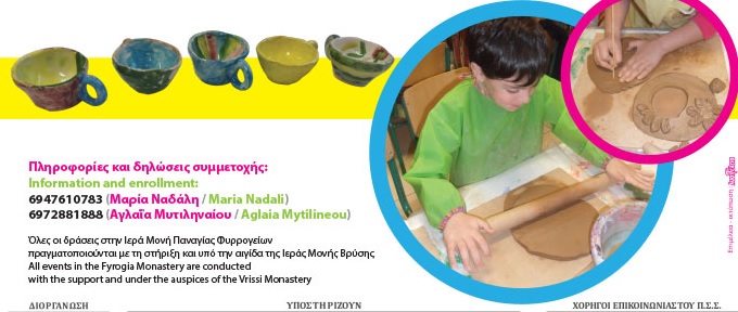 Η κεραμίστρια Μαρία Ατσώνιου προσκαλεί τα παιδιά της Σίφνου από 4 ετών και άνω στο Μοναστήρι των Φυρογγείων για να τα μυήσει στην τέχνη της πηλοπλαστικής και να δημιουργήσει μαζί τους κατασκευές με πηλό.