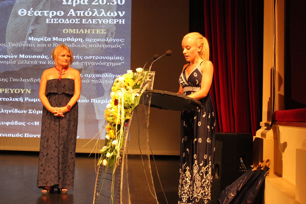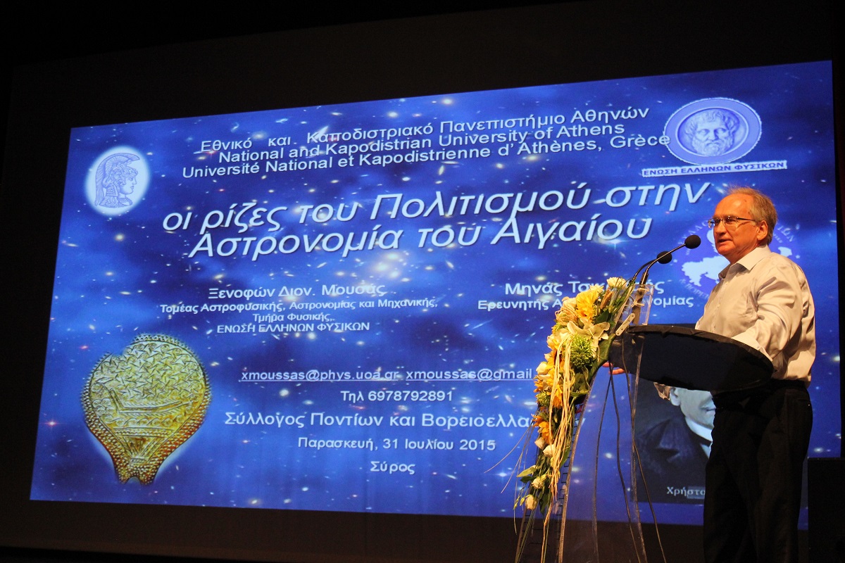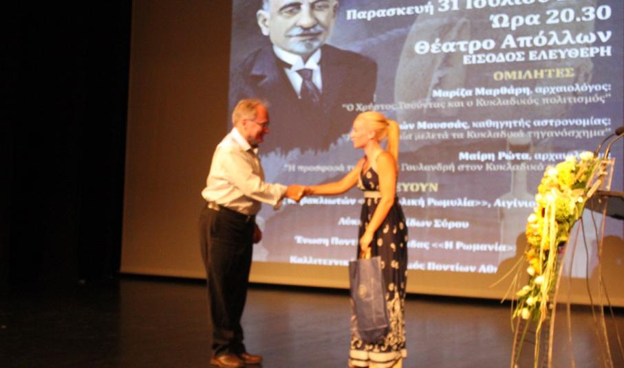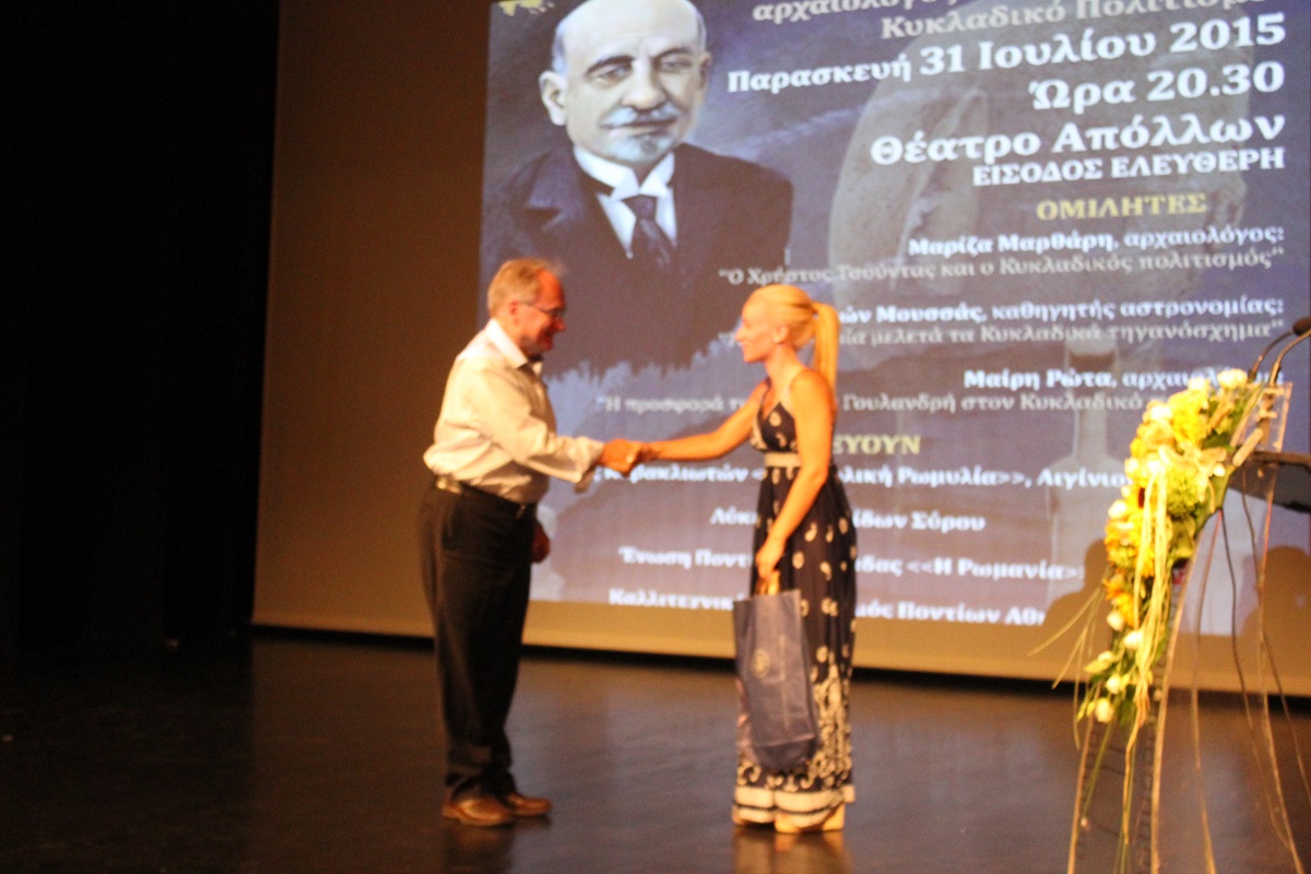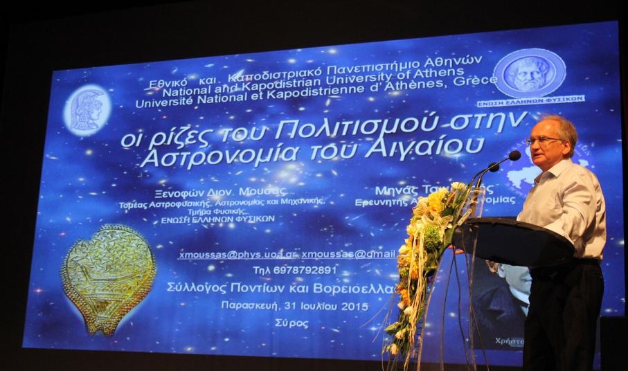 Στη συνέχεια, το λόγο πήρε ο καθηγητής αστρονομίας κ. Ξενοφών Μουσάς ο οποίος ανέπτυξε το θέμα «Η αστρονομία μελετά το Κυκλαδικό Τηγανόσχημα».