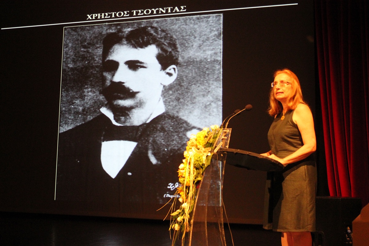 Το κοινό καλωσόρισε η πρόεδρος του Συλλόγου κ. Ουρανία Πανταζίδου, η οποία τόνισε ότι το αφιέρωμα στον Χρήστο Τσούντα πραγματοποιείται την ίδια ακριβώς ημέρα, όπου ο ίδιος πάτησε για πρώτη φορά το πόδι του στην Χαλανδριανή και το Καστρί της Σύρου (Παρασκευή 31 Ιουλίου 1898).