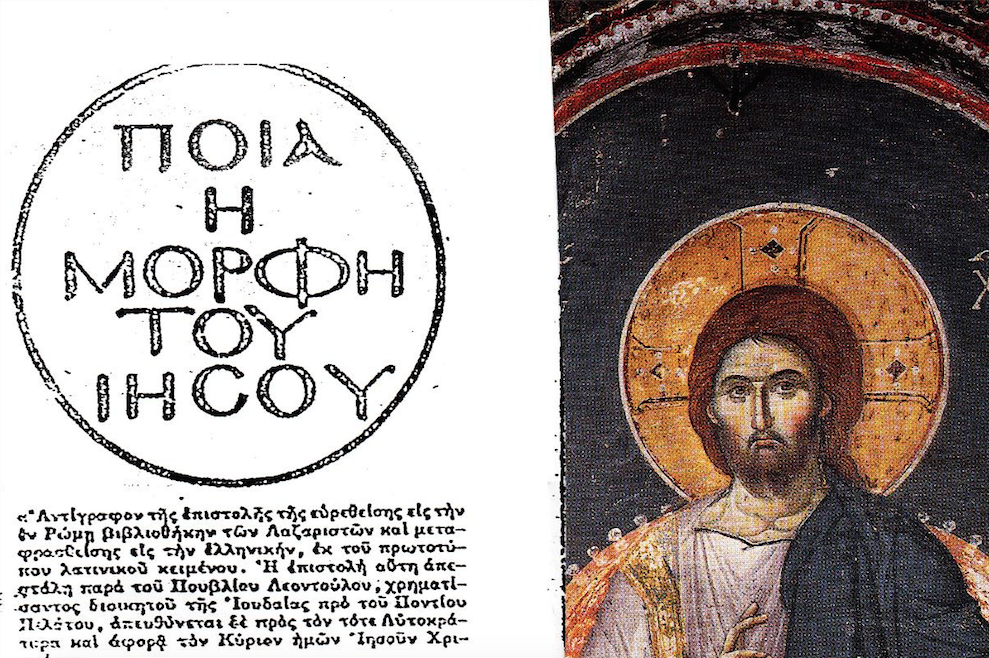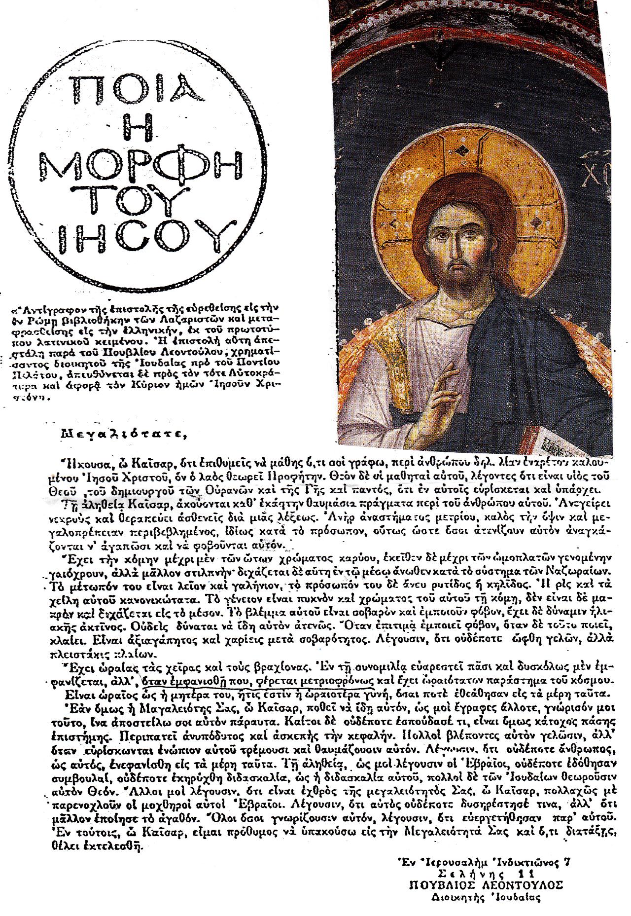 Είναι μια επιστολή που εστάλει, τότε, από τον Διοικητή της Ιουδαίας προς τον αυτοκράτορα της Ρώμης. Μετά τον ενδιαφέροντα τίτλο: «Ποια η Μορφή του Ιησού», αντιγράφω την επιστολή σε απλά ελληνικά, ώστε να γίνει κατανοητή από τους νέους που δεν τους είναι γνωστή η καθαρεύουσα.