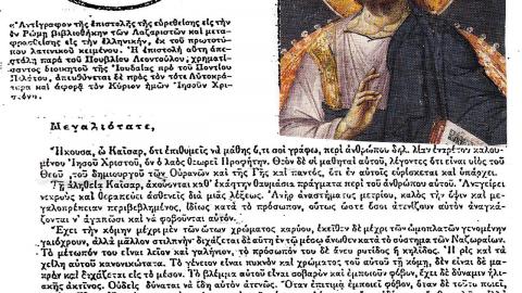 ήκουσα, ω Καίσαρ, ότι επιθυμείς να μάθεις, γι’ αυτό και σου γράφω, για έναν άνθρωπο που είναι πολύ ενάρετος και ονομάζεται Ιησούς Χριστός, τον οποίον ο λαός τον θεωρεί προφήτην. Οι μαθηταί του τον θεωρούν Θεόν, λέγοντας ότι είναι γιός του Θεού, του δημιουργού των Ουρανών και της Γης και των πάντων και ανάμεσα τους ευρίσκεται και υπάρχει.