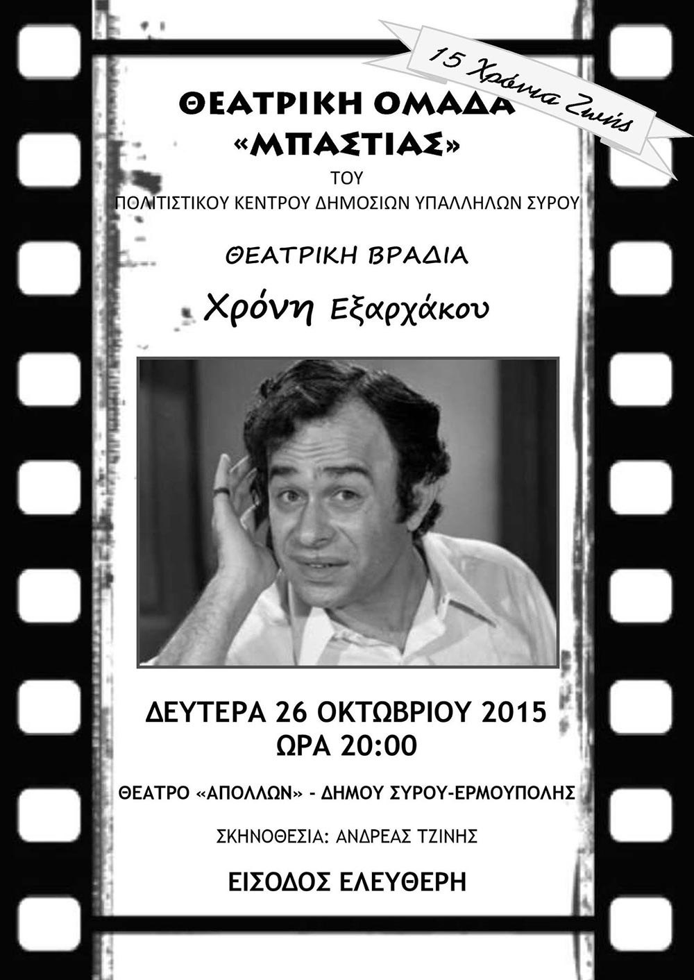 Τη Δευτέρα 26 Οκτωβρίου στις 20:00, η θεατρική ομάδα «ΜΠΑΣΤΙΑΣ» παρουσιάζει μια βραδιά αφιερωμένη στον μεγάλο Συριανό ηθοποιό Χρόνη Εξαρχάκο. Στην εκδήλωση θα παρουσιαστούν 8 θεατρικά αποσπάματα από 8 γνωστές κινηματογραφικές ταινίες του ηθοποιού: