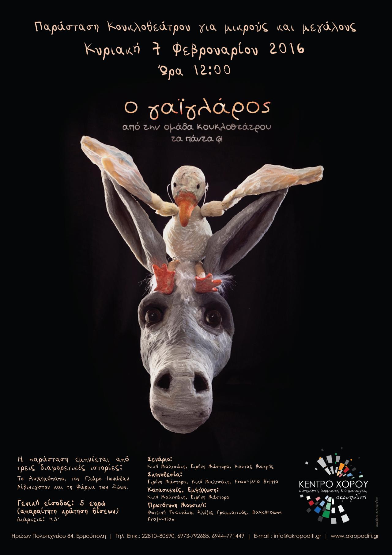Η παράσταση έχει διάρκεια 45’ και θα πραγματοποιηθεί την Κυριακή 7 Φεβρουαρίου 2016 στις 12:00 στο Κέντρο Χορού “Ακροποδητί”.