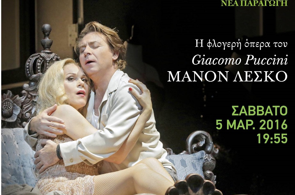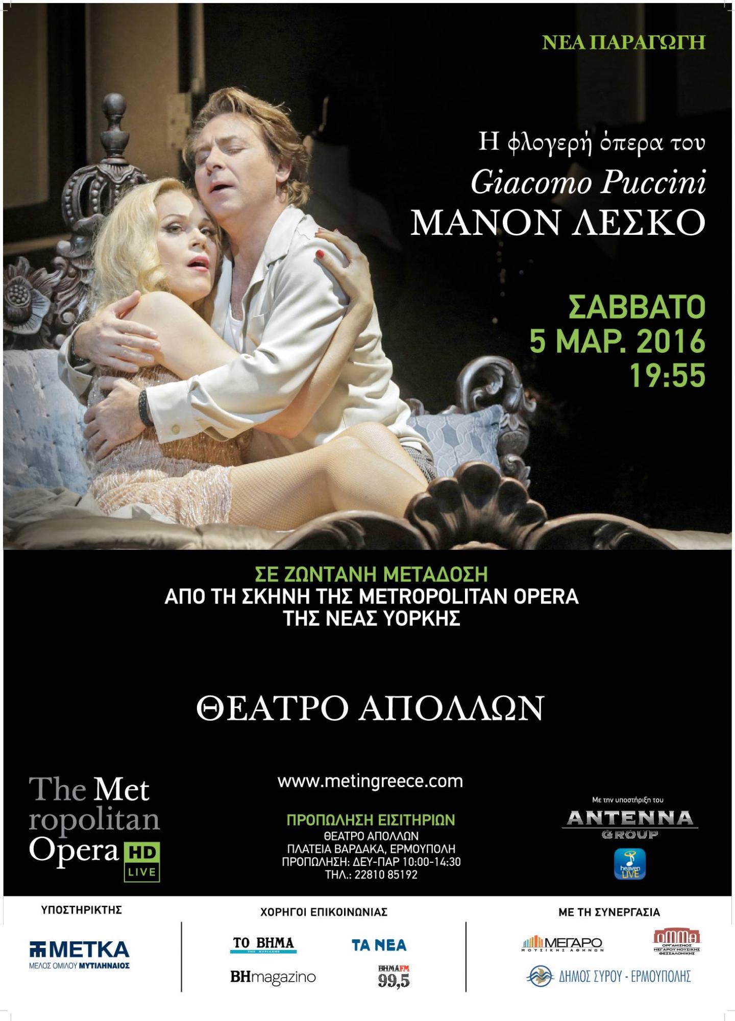 Το βραβευμένο πρόγραμμα “The Met: Live in HD”, μετά τις εκπληκτικές παραστάσεις «ΤΡΟΒΑΤΟΡΕ», «ΟΘΕΛΛΟΣ», «ΤΑΝΧΟΪΖΕΡ», «ΛΟΥΛΟΥ», «ΑΛΙΕΙΣ ΜΑΡΓΑΡΙΤΑΡΙΩΝ» και «ΤΟΥΡΑΝΤΟΤ», που μάγεψαν το κοινό, παρουσιάζει το Σάββατο 5 Μαρτίου 2016 και ώρα 19:55, στο Θέατρο Απόλλων, σε ζωντανή μετάδοση από τη Νέα Υόρκη, το αριστούργημα του Giacomo Puccini «ΜΑΝΟΝ ΛΕΣΚΟ».