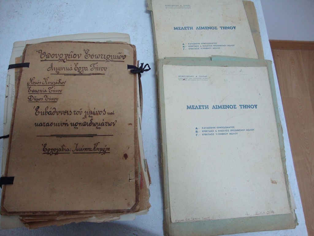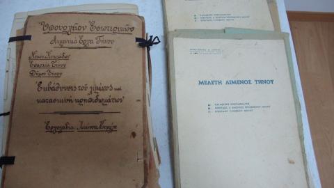 Φάκελοι Ληξιαρχείου, Βιβλία (Πρακτικά Συνεδριάσεων, Πρωτόκολλα Αλληλογραφίας, Αποφάσεις Δημάρχου κ.λπ.) και ορισμένα έγγραφα σε φακέλους. Εντοπίστηκε επίσης ένα Μητρώο Αρρένων ετών 1839-1888 εντοπίστηκαν στο κτίριο του παλαιού Δημαρχείου. Διερεύνηση πραγματοποιήθηκε και στους χώρους του κτιρίου όπου στεγαζόταν παλαιότερα το Δημαρχείο και σήμερα στεγάζεται το τοπικό παράρτημα Προσκόπων. Κατά την παραμονή της στην Τήνο, η αποστολή του ΕΙΕ επισκέφτηκε το Αρχείο της Καθολικής Επισκοπής Τήνου στην Ξυνάρα, όπου φυλάσσεται σημαντικό υλικό (ελληνικό, βενετικό, οθωμανικό), το οποίο αφορά στον καθολικό πληθυσμό του Αιγαιακού χώρου και χρονολογείται από τον 16ο αιώνα. Η ερευνητική αποστολή επισκέφτηκε επίσης τις εγκαταστάσεις του Ιδρύματος Αγίας Τριάδας στα Γύρλα, όπου καταγράφηκαν 20 βιβλία που χρονολογούνται από τη δεκαετία του 1920 και φάκελα με 3.000 περίπου έγγραφα τοποθετημένα με χρονολογική τάξη.