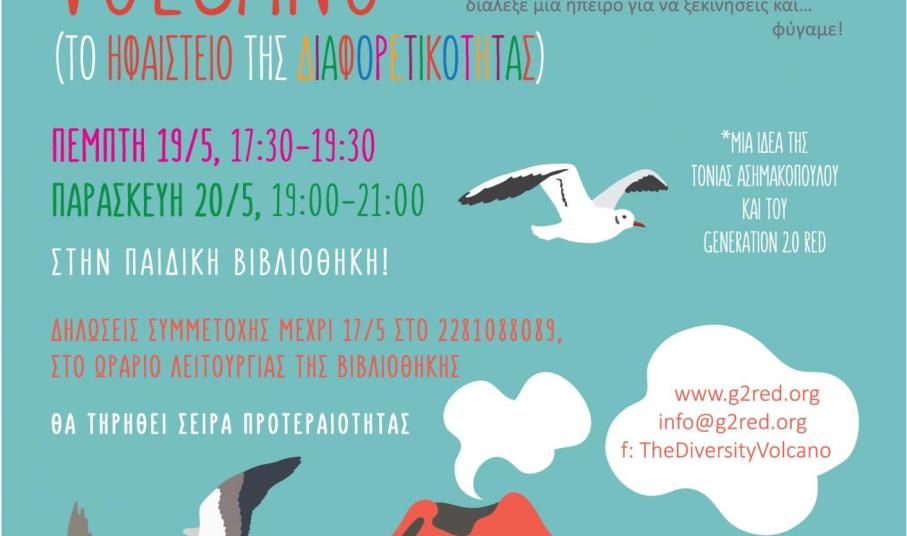 Η Δημοτική Βιβλιοθήκη, η Βαρδάκειος Σχολή και η Μη Κυβερνητική Οργάνωση Generation 2.0 for Rights, Equality and Diversity συνεργάζονται για να φέρουν στη Σύρο το παιχνίδι The Diversity Volcano – Το Ηφαίστειο της Διαφορετικότητας, ένα πρωτοποριακό παιχνίδι που χρησιμοποιείται ως εναλλακτικό εκπαιδευτικό εργαλείο με στόχο την κατανόηση και την εξοικείωση των μαθητών με έννοιες όπως αυτή της διαφορετικότητας, της διαπολιτισμικότητας και των ανθρωπίνων δικαιωμάτων!