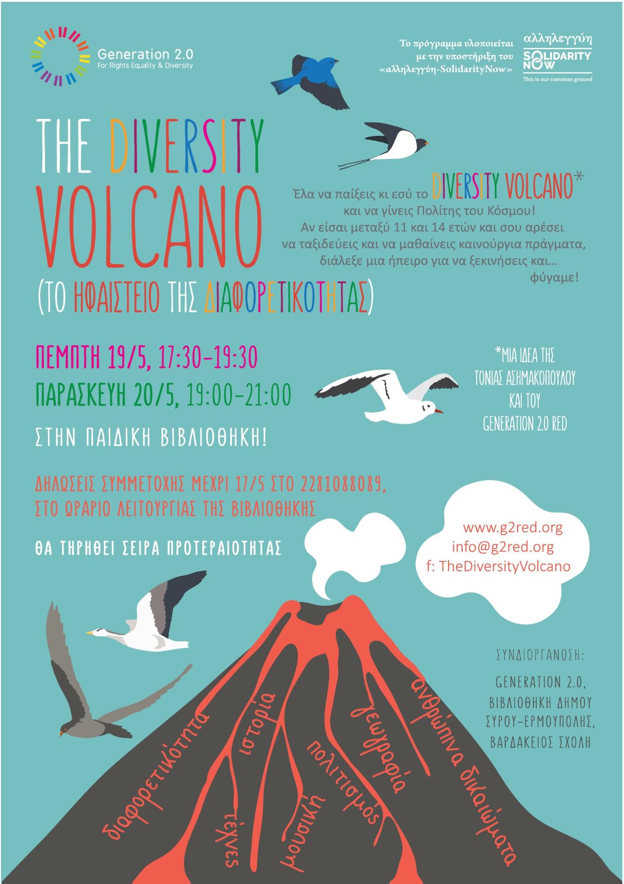 Το «Diversity Volcano» απευθύνεται σε μαθητές από 11 έως 14 ετών και στοχεύει στην αναγνώριση των θεμελιωδών ανθρωπίνων δικαιωμάτων και στην κατανόηση της σημασίας τους σε παγκόσμιο επίπεδο. Πρόκειται για ένα επιδαπέδιο παιχνίδι γνώσεων το οποίο δημιουργήθηκε σε συνεργασία με παιδαγωγούς που ειδικεύονται σε παιχνίδια, για την έμπρακτη αξιοποίηση των γνώσεων που έχουν διδαχθεί τα παιδιά από την Ε’ Δημοτικού έως και την Γ’ Γυμνασίου. Οι παίκτες καλούνται να μετακινηθούν πάνω σε έναν παγκόσμιο χάρτη απαντώντας ερωτήσεις γνώσεων και να γίνουν Πολίτες του Κόσμου! Οι ερωτήσεις διαφέρουν σε δυσκολία ανάλογα με τις ηλικίες των παιδιών.