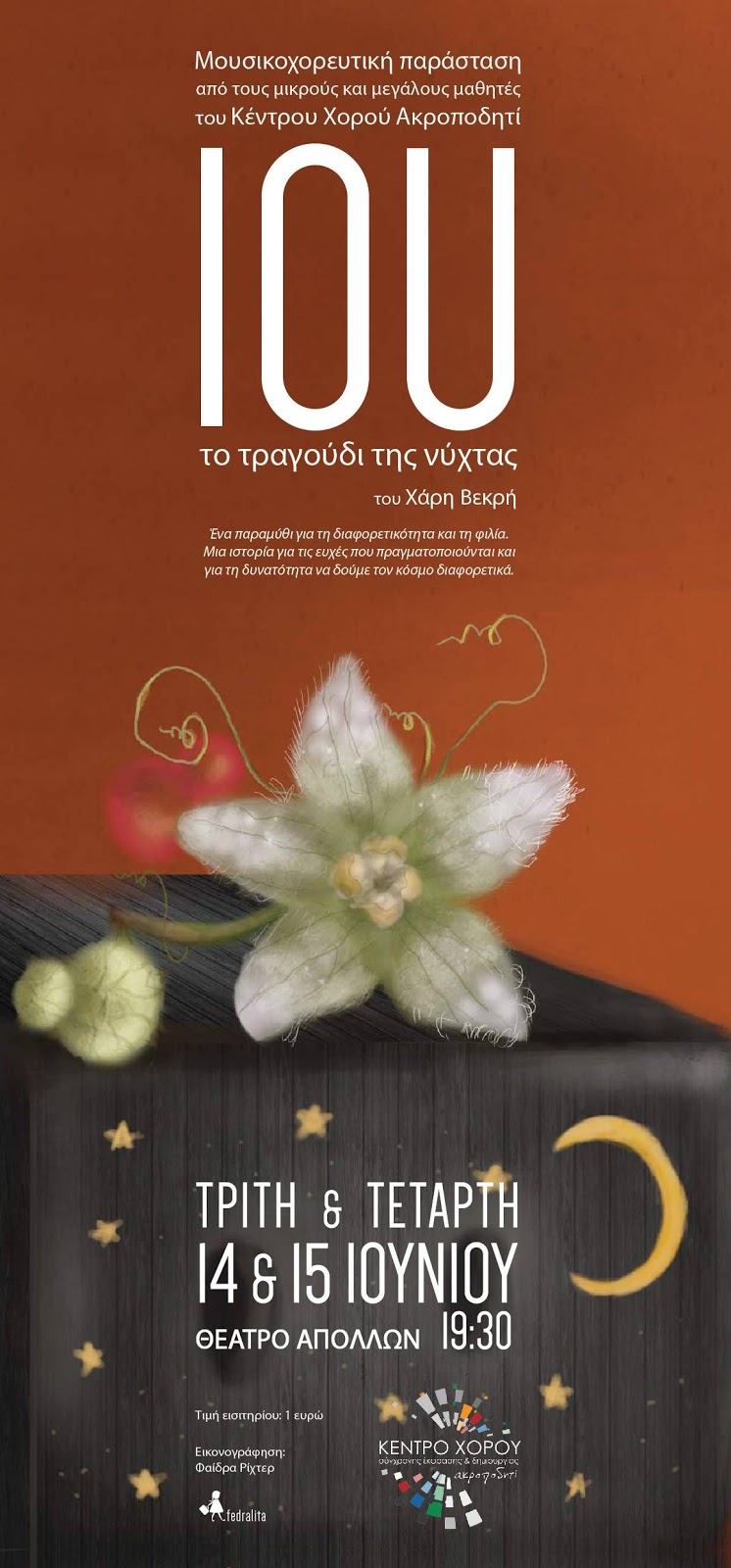 Το έργο «Ίου – Το τραγούδι της Νύχτας» αποτελεί το δεύτερο συγγραφικό «παιδί» του κ. Βεκρή το οποίο μεταμορφώνεται σε μία μουσικοχορευτική παράσταση από τους μικρούς και μεγάλους μαθητές του Κέντρου.
