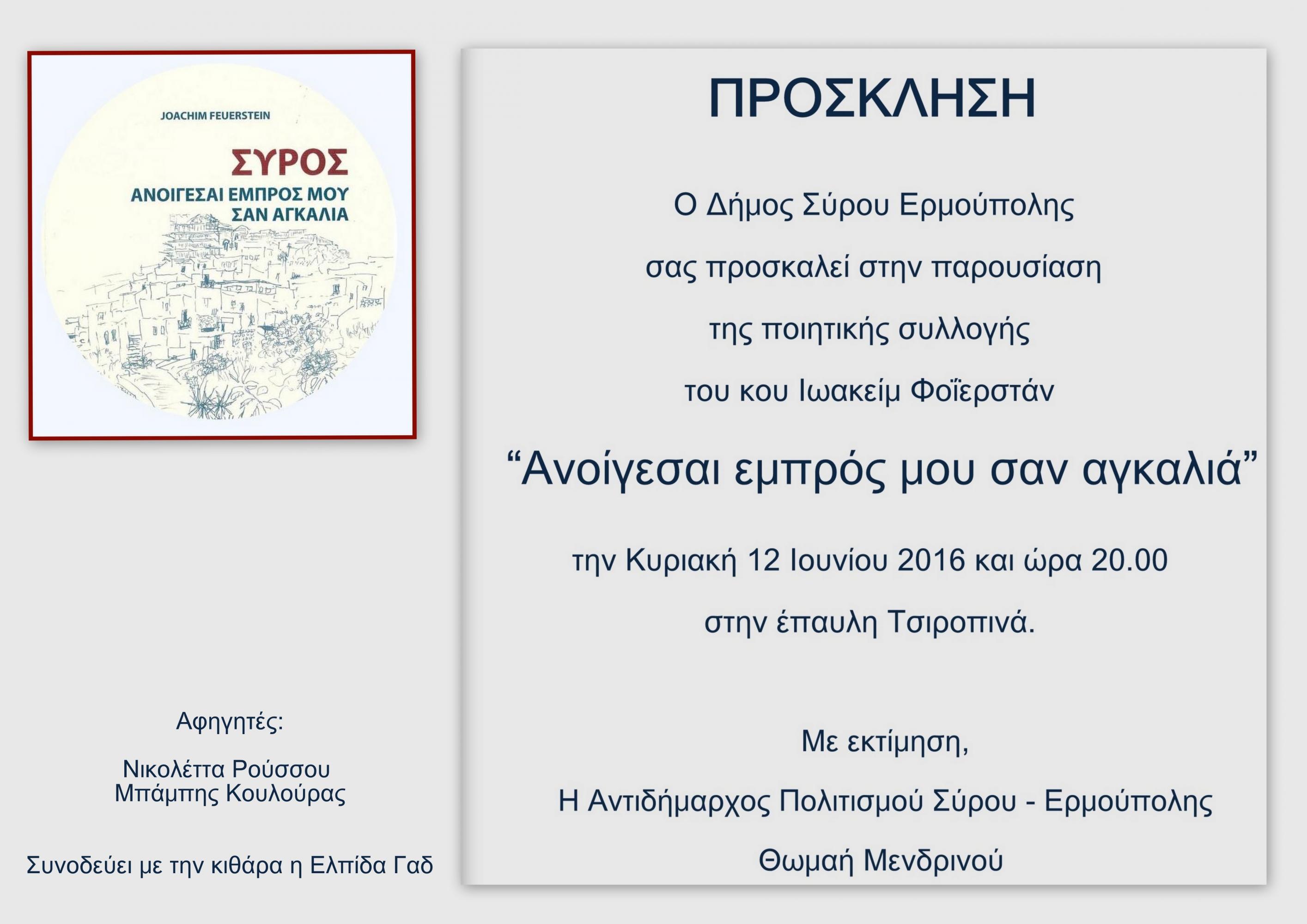 Την Κυριακή 12 Ιουνίου 2016 και ώρα 20:00, στην Έπαυλη Τσιροπινά στην Ποσειδωνία, θα πραγματοποιηθεί παρουσίαση της ποιητικής συλλογής του κ. Ιωακείμ Φοϊερστάιν «Ανοίγεσαι εμπρός μου σαν αγκαλιά».