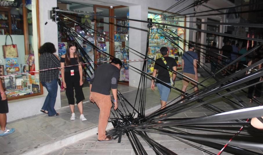 Στη συνέχεια, το κοινό κλήθηκε να μπει σε «ουρές» και να περάσει από διάφορες δοκιμασίες (κλειστά σύνορα με κορδέλες και μαύρες κολλητικές ταινίες) προκειμένου να φτάσει στη «Γη της Επαγγελίας», στα σημεία δηλαδή των video installation.