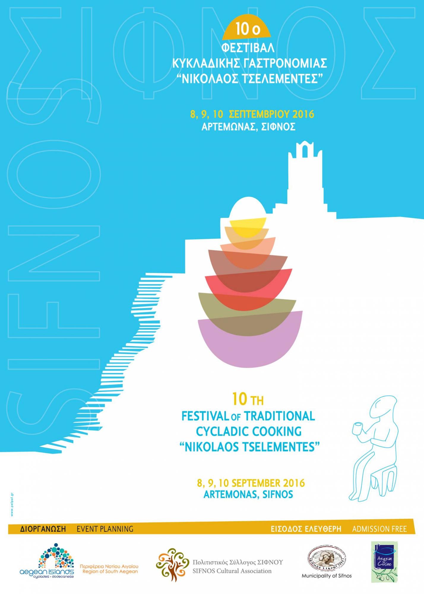 Στις 8 – 9 – 10 Σεπτεμβρίου, στη Σίφνο, στήνεται μια μεγάλη κυκλαδίτικη γιορτή που αγκαλιάζει όλη την Ελλάδα και ανοίγει τα φτερά της λίγο περισσότερο για να χωρέσει και περιοχές εκτός Ελλάδας. Υπόσχεται αληθινές γεύσεις και αυθεντικές μουσικές, καλλιτεχνικές εκδηλώσεις και ενδιαφέρουσες συζητήσεις, παραδοσιακές τέχνες και έθιμα, κλασική φιλοξενία και πολύ κέφι όπως πάντα. Και ακόμη περισσότερο αφού φέτος έχουμε ένα λόγο παραπάνω: