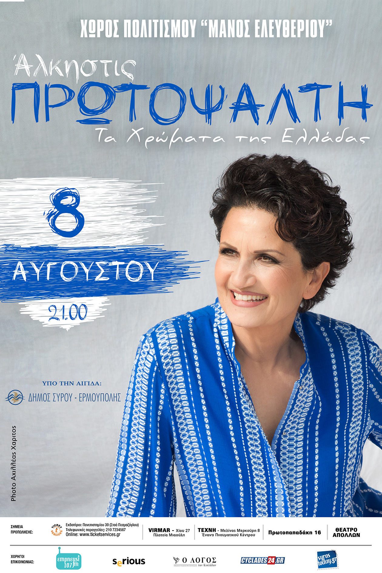 Η πολυαναμενόμενη συναυλία της Άλκηστης Πρωτοψάλτη περιλαμβάνεται, μεταξύ άλλων στις προσεχείς εκδηλώσεις του προγράμματος «Σύρος – Πολιτισμός 2016» που θα πραγματοποιηθούν από σήμερα 6 Αυγούστου έως την Παρασκευή 12 Αυγούστου.