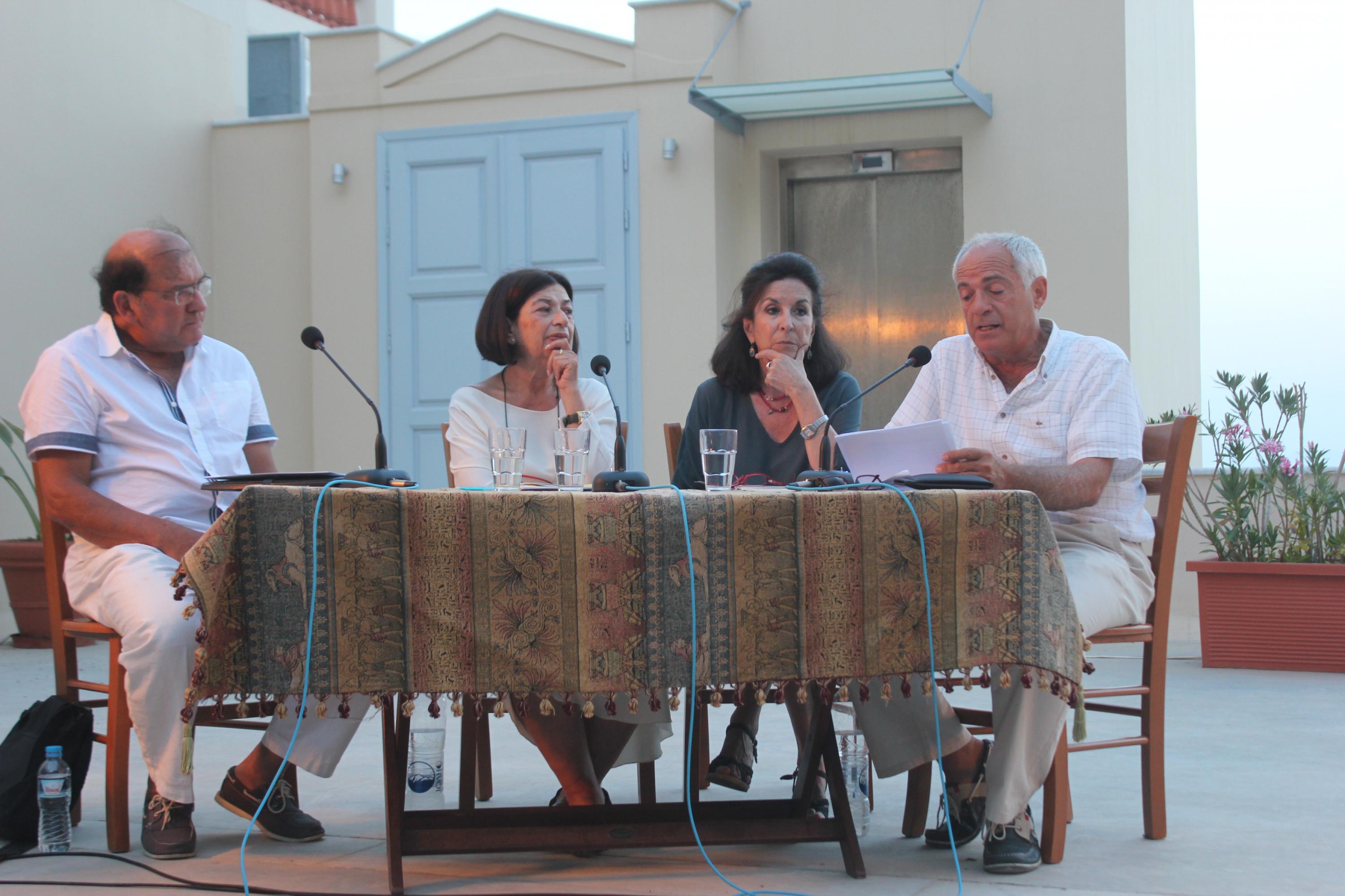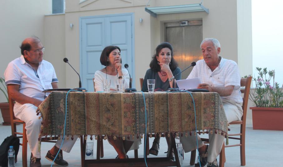 «Πρώτα από όλα αυτά είναι τιμητικό να σε βάζει κανείς δίπλα στον Μάνο Ελευθερίου. Και τι δεν έχει γράψει αυτός ο άνθρωπος. Δεν μπορώ να σταθώ δίπλα του. Νιώθω πολλή συστολή. Τον Μάνο Ελευθερίου πάντα τον αγαπούσα, τον εκτιμούσα και πλέον είμαστε φίλοι. Πριν 40 χρόνια, όταν έφευγα από το νησί για να πάω στην Αθήνα, κάποιος μου έφερε ένα βιβλίο. Ήταν του Μάνου Ελευθερίου και τότε δεν ήξερα ότι είναι Συριανός. Τα τραγούδια του τα λάτρεψα. Αυτούς με τους οποίους συνδέω τον τόπο μου, είναι δύο άνθρωποι που έφυγαν πρόσφατα από τη ζωή. Ο φιλόσοφος και φίλος Ευάγγελος Ρούσσος – με τον Μάνο τον αποκαλούμε «δάσκαλο». Αυτός κι αν ήταν που συνόδευσε το ταξίδι μου με τη φιλοσοφία του. Κι έπειτα, την αδελφή του Μάνου, Αγγελική Ελευθερίου η οποία είχε γράψει εξαιρετικά ποιήματα».