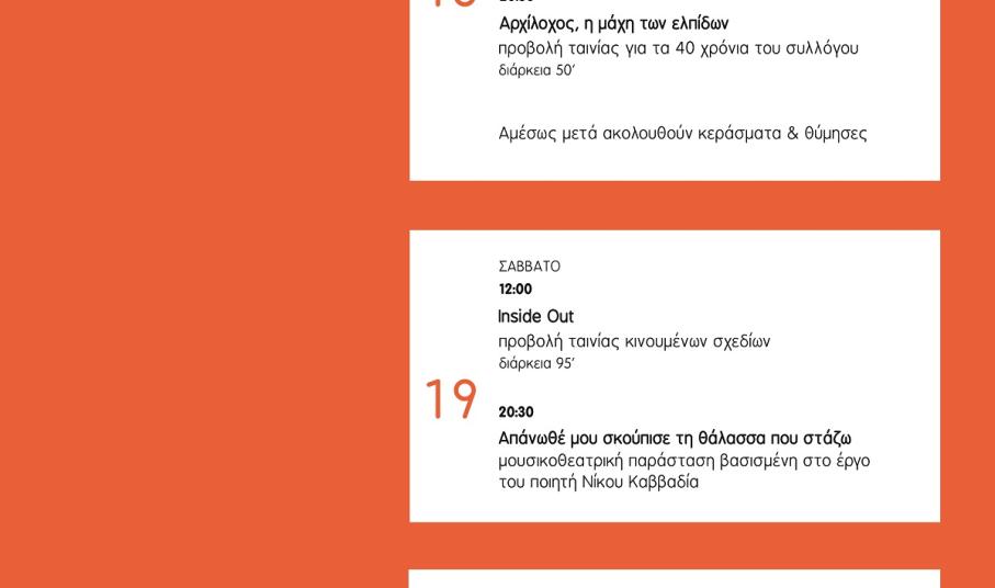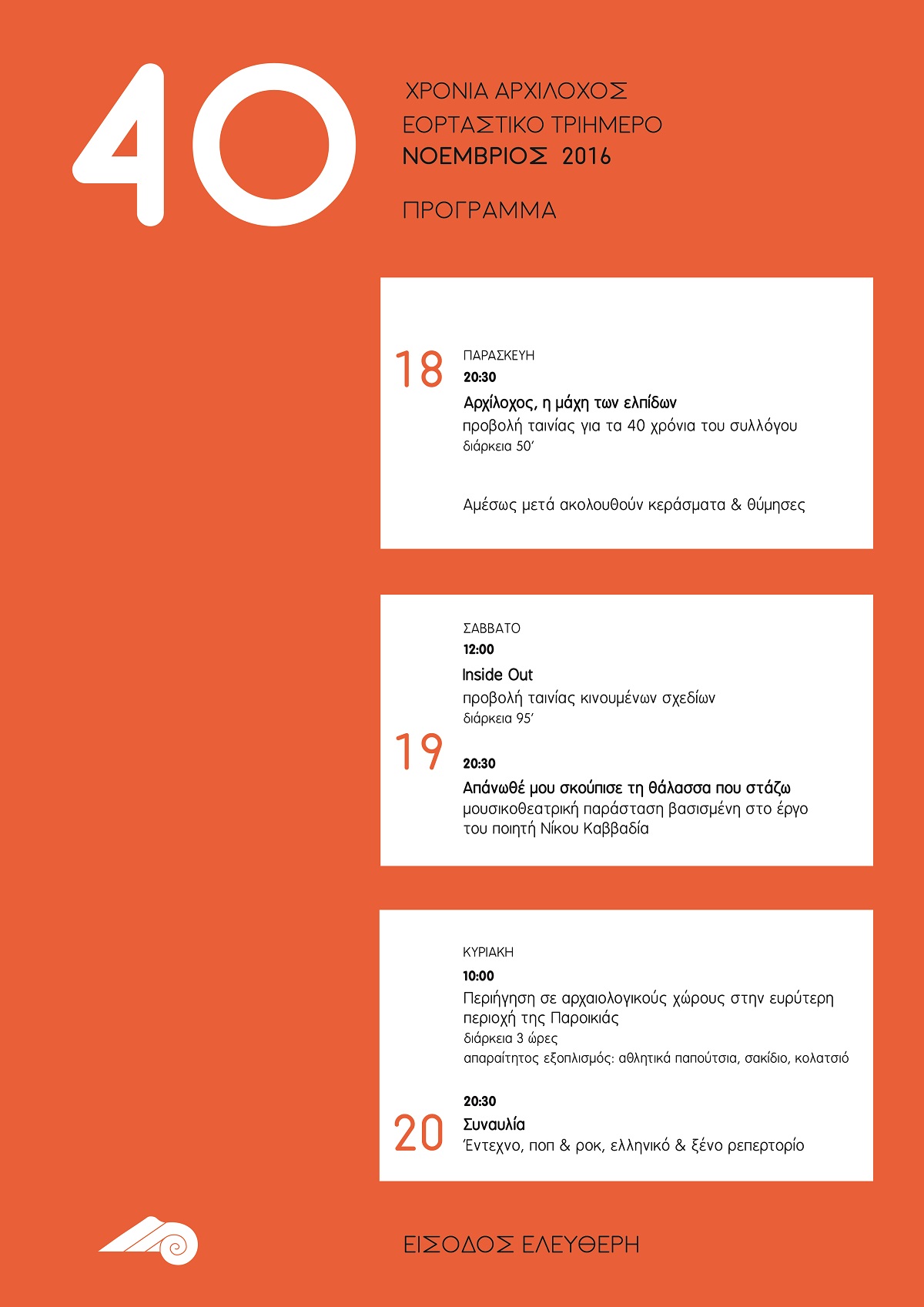 Σας καλούμε σε ένα εορταστικό τριήμερο που θα ξεκινήσει την Παρασκευή 18 Νοεμβρίου, στις 20:30 με την προβολή του ντοκιμαντέρ «Αρχίλοχος, η μάχη των ελπίδων», αφιέρωμα στα 40 χρόνια πολιτιστικής δραστηριότητας του.