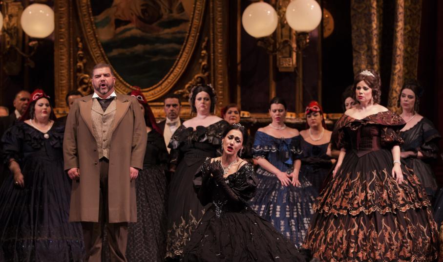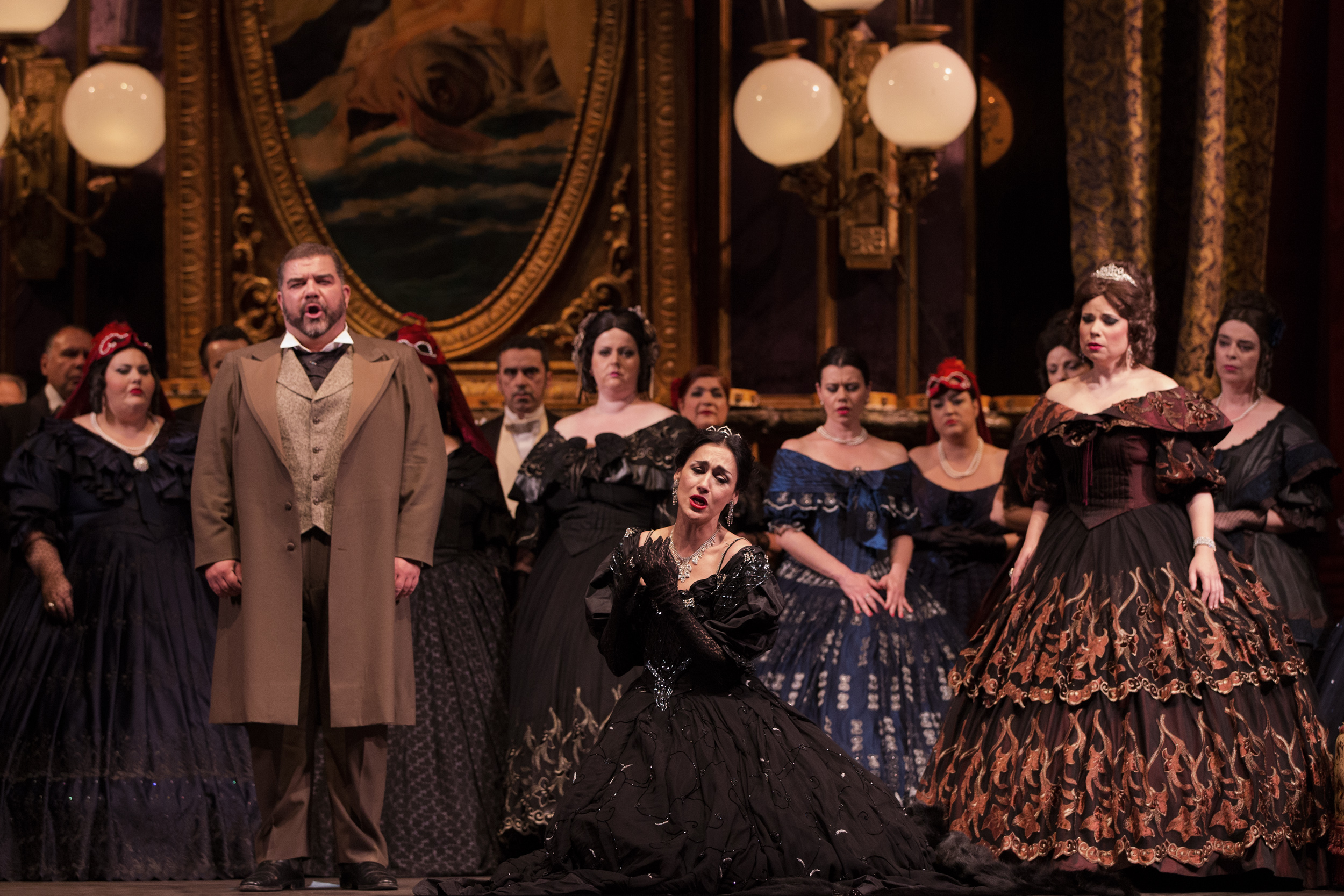 Στον πρωταγωνιστικό ρόλο της Βιολέτας, η διεθνώς καταξιωμένη Ελληνίδα σοπράνο Μυρτώ Παπαθανασίου, η οποία έχει ερμηνεύσει τον ρόλο στα πέρατα του κόσμου με ιδιαίτερη επιτυχία. Μάλιστα, για την ερμηνεία της σε αυτόν τιμήθηκε το 2012 με το βραβείο «Μαρία Κάλλας» για τον καλύτερο πρωτοεμφανιζόμενο καλλιτέχνη στην Όπερα του Ντάλλας. Η Παπαθανασίου σημείωσε μια σπουδαία ερμηνεία φωνητικά, αλλά και υποκριτικά.